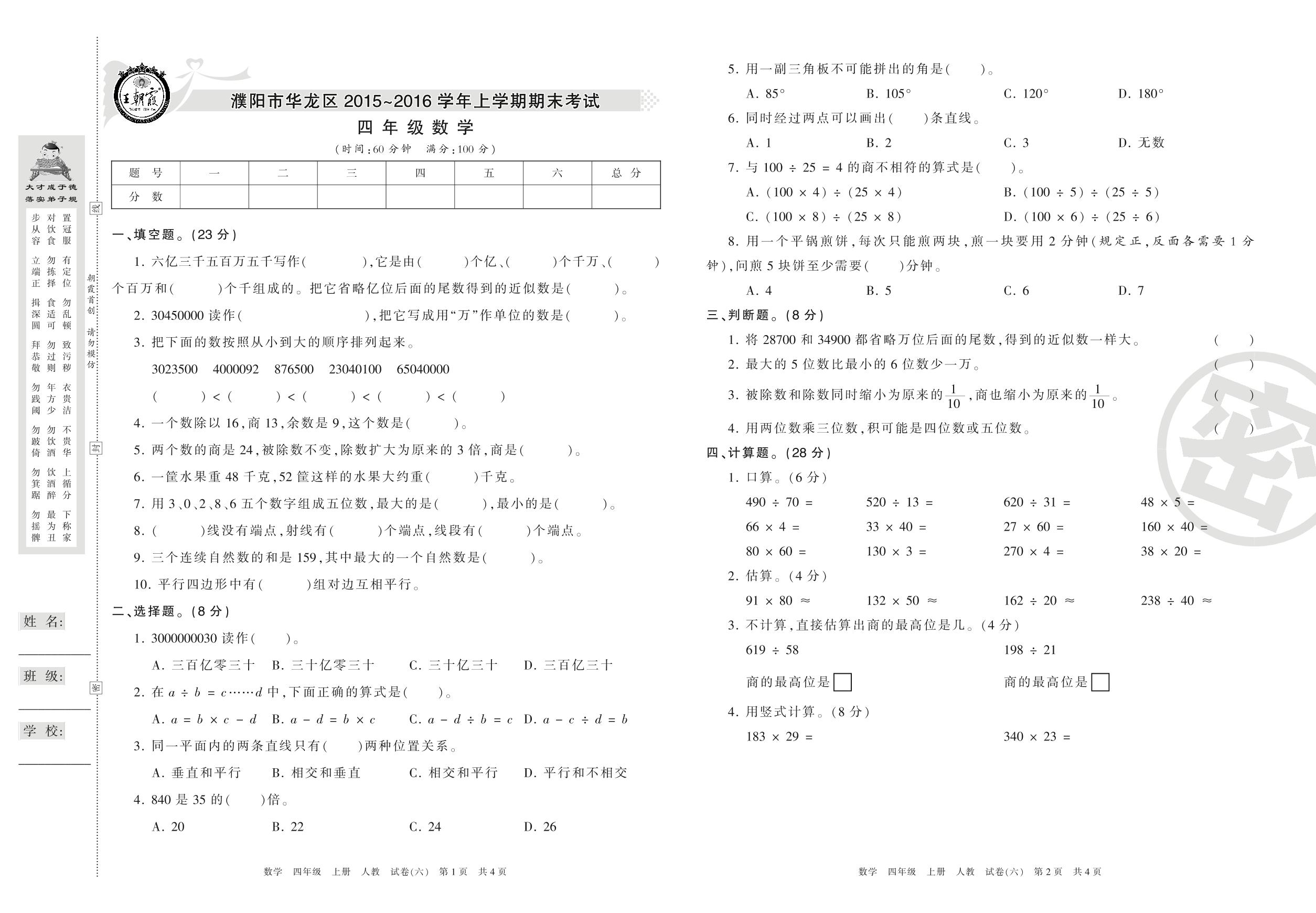 2015-2016学年第一学期濮阳市华龙区四年级数学试卷(人教版)【6】