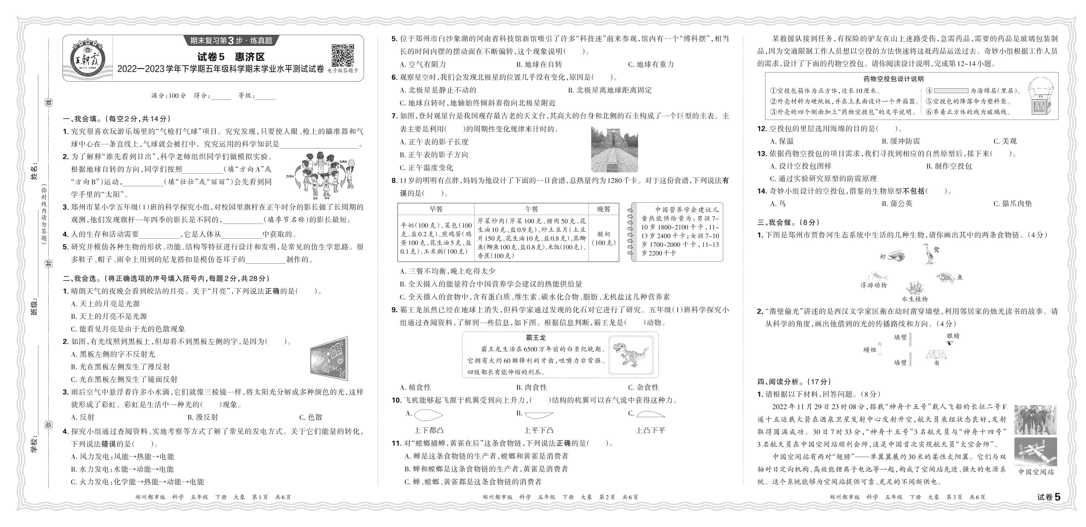 河南省郑州市惠济区2022—2023学年下学期五年级科学期末学业水平测试试卷(大象版)【5】