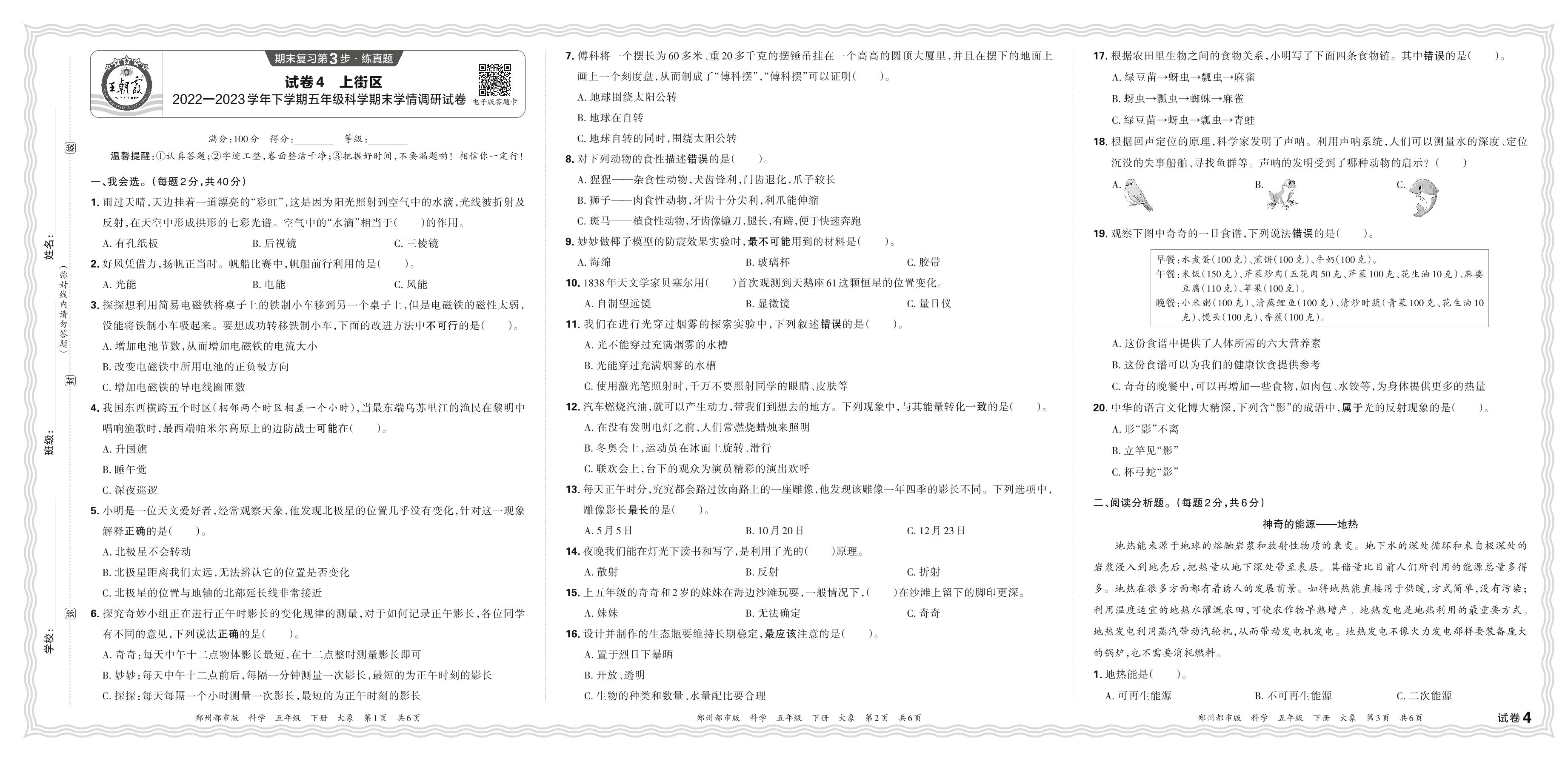 河南省郑州市上街区2022—2023学年下学期五年级科学期末学情调研试卷(大象版)【4】