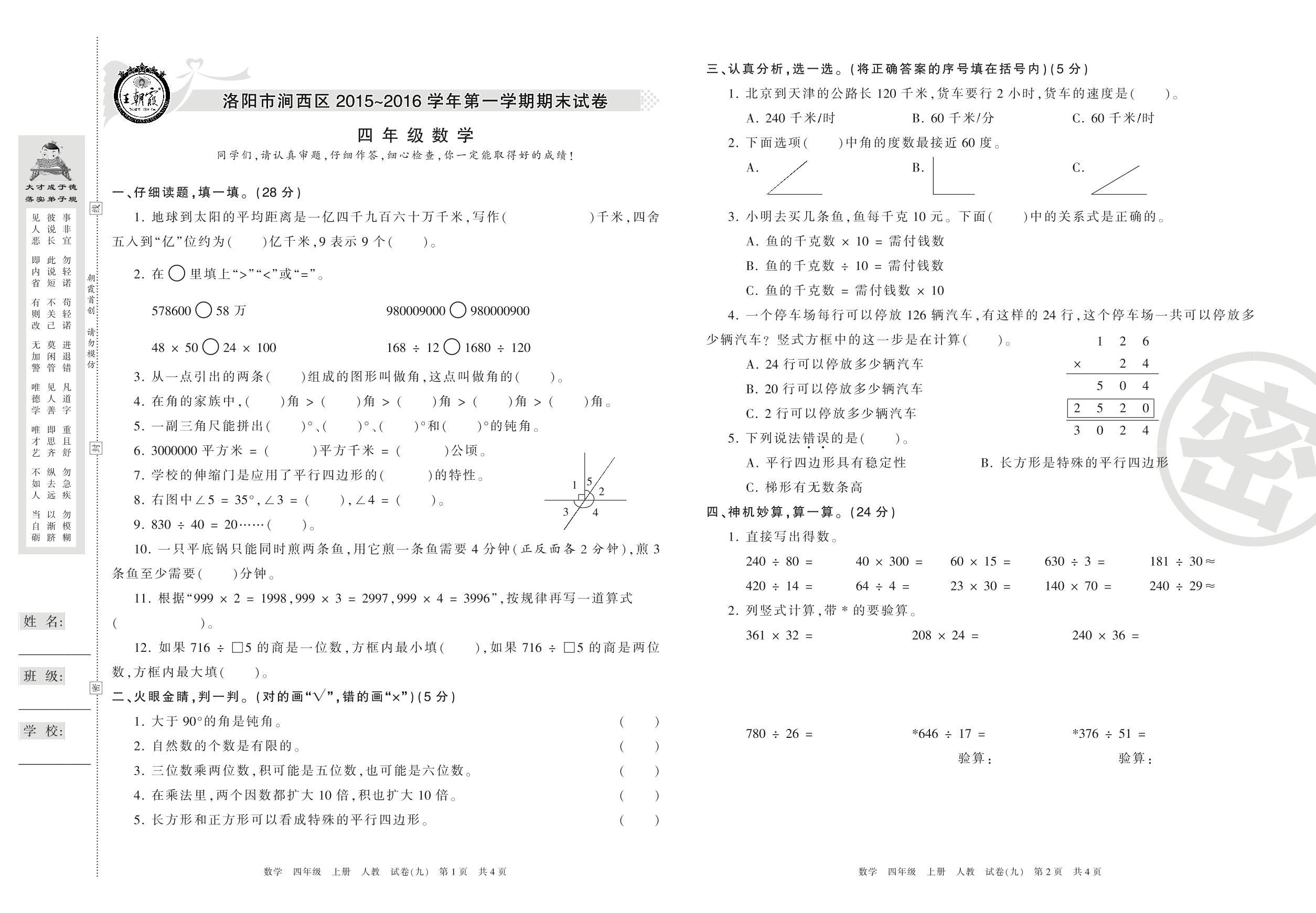 2015-2016学年第一学期洛阳市涧西区四年级数学试卷(人教版)【9】