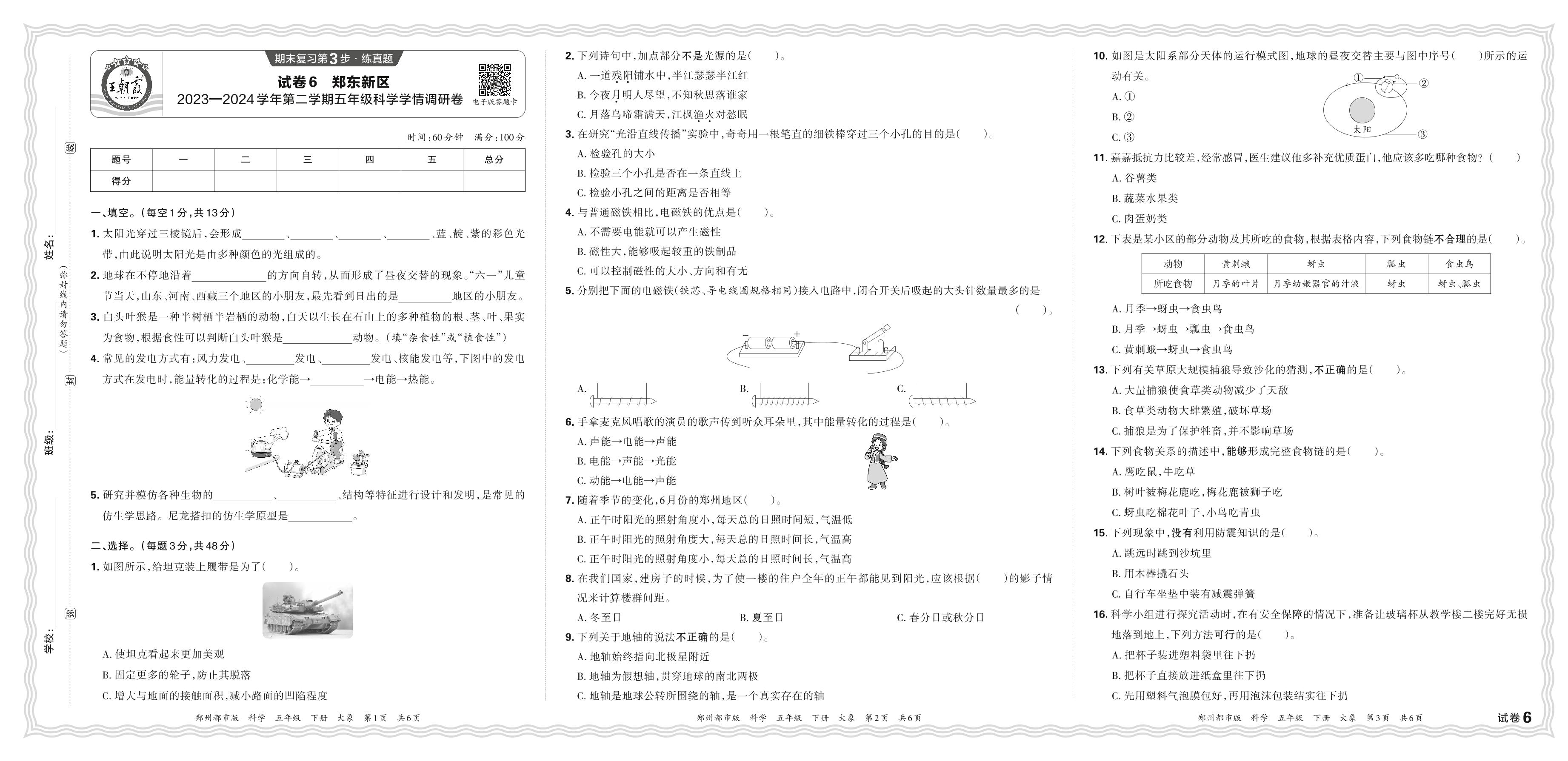 河南省郑州市郑东新区2023—2024学年第二学期五年级科学学情调研卷(大象版)【6】
