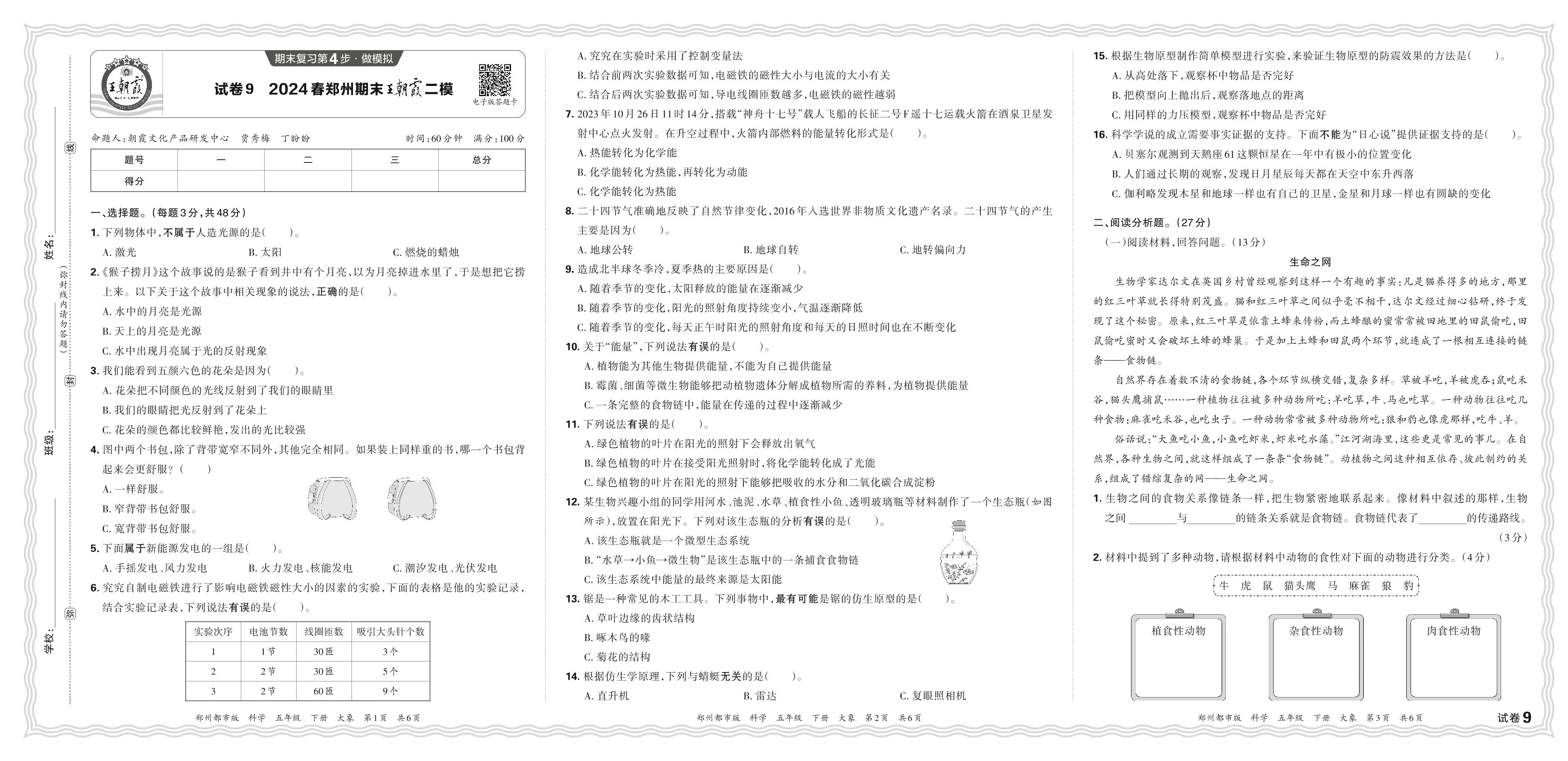 2024春下册五年级科学大象版 河南郑州王朝霞二模