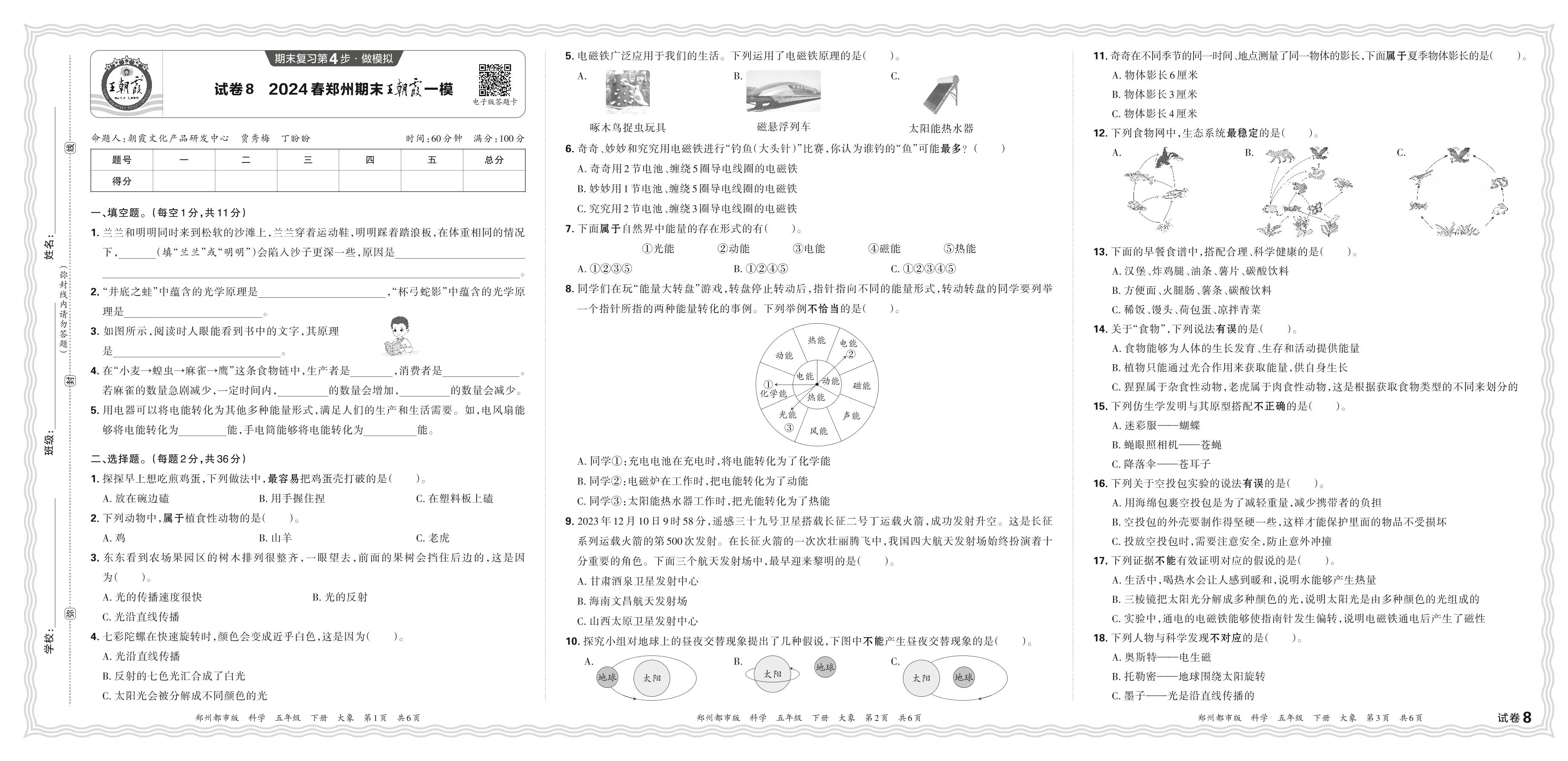 2024春下册五年级科学大象版 河南郑州王朝霞一模