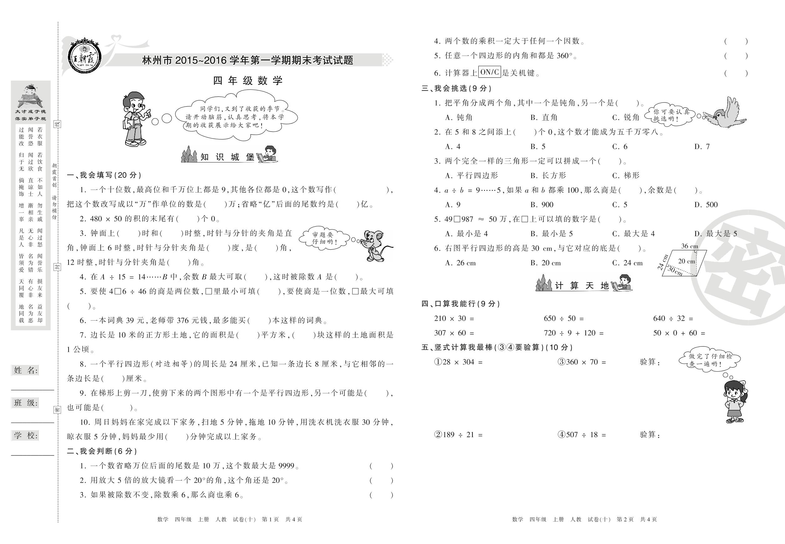 2015-2016学年第一学期林州市四年级数学试卷(人教版)【10】