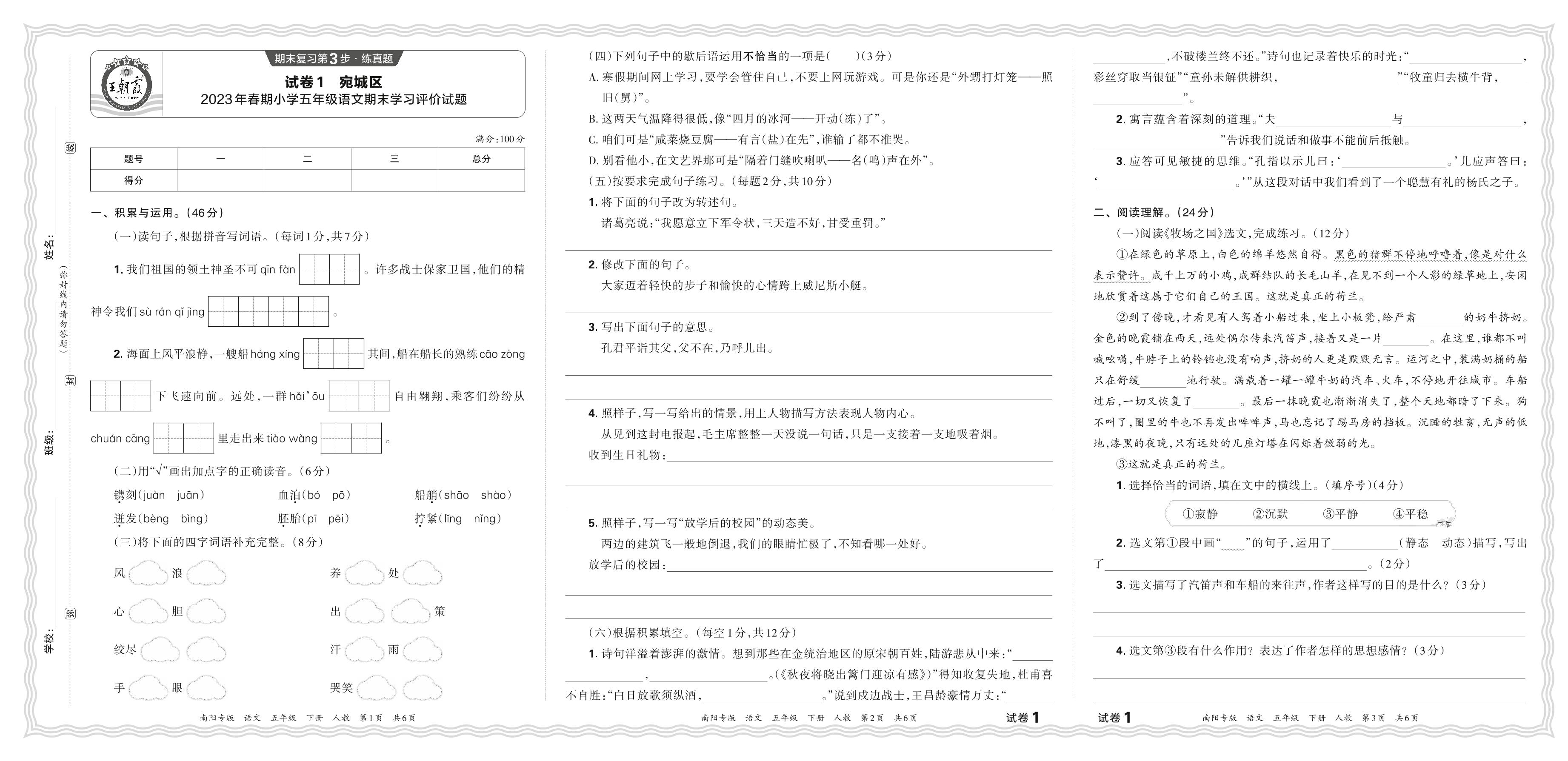 河南省南阳市宛城区2023年春期小学五年级语文期末学习评价试题(人教版)【1】