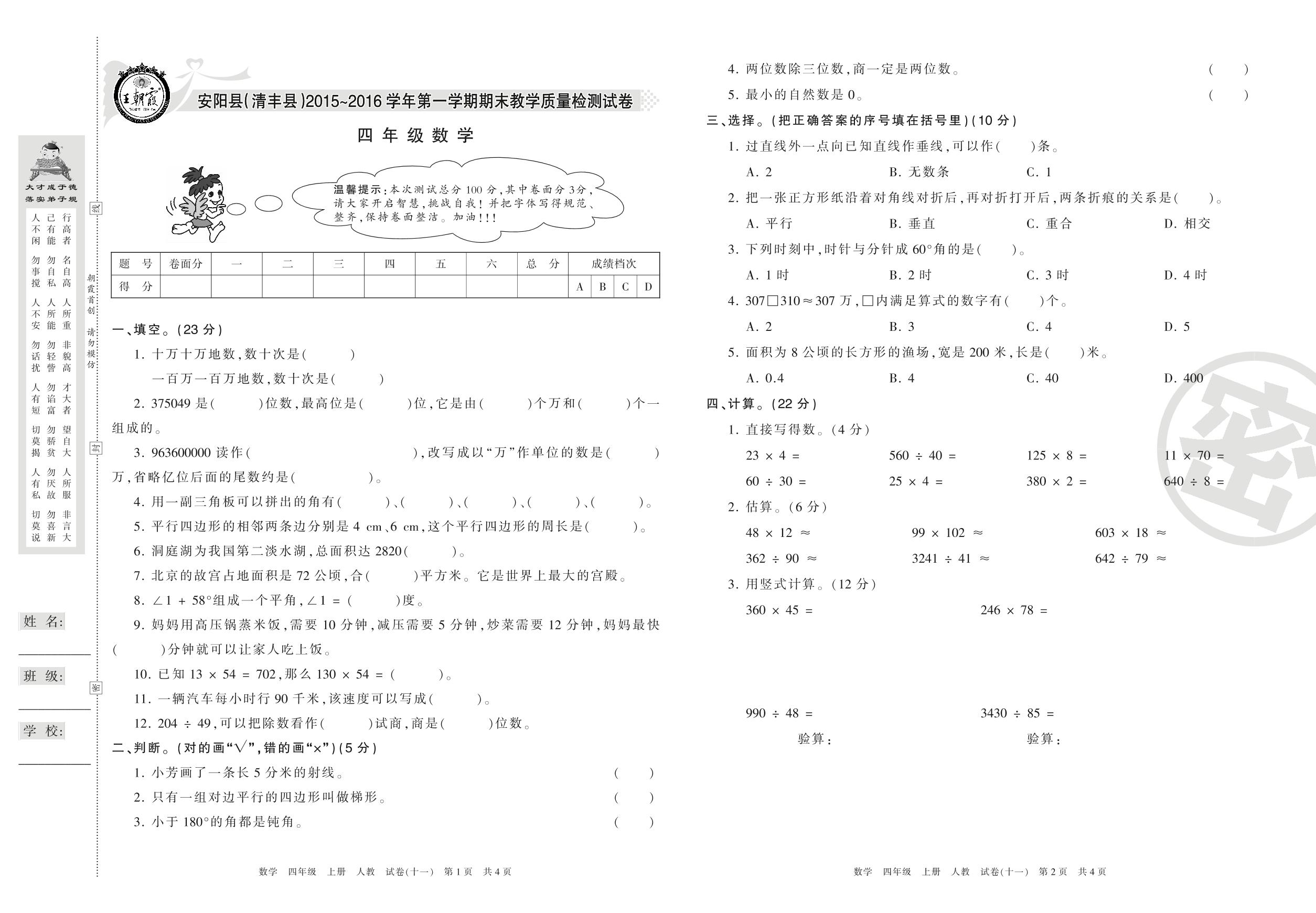 2015-2016学年第一学期安阳市安阳县(清丰县)四年级数学试卷(人教版)【11】