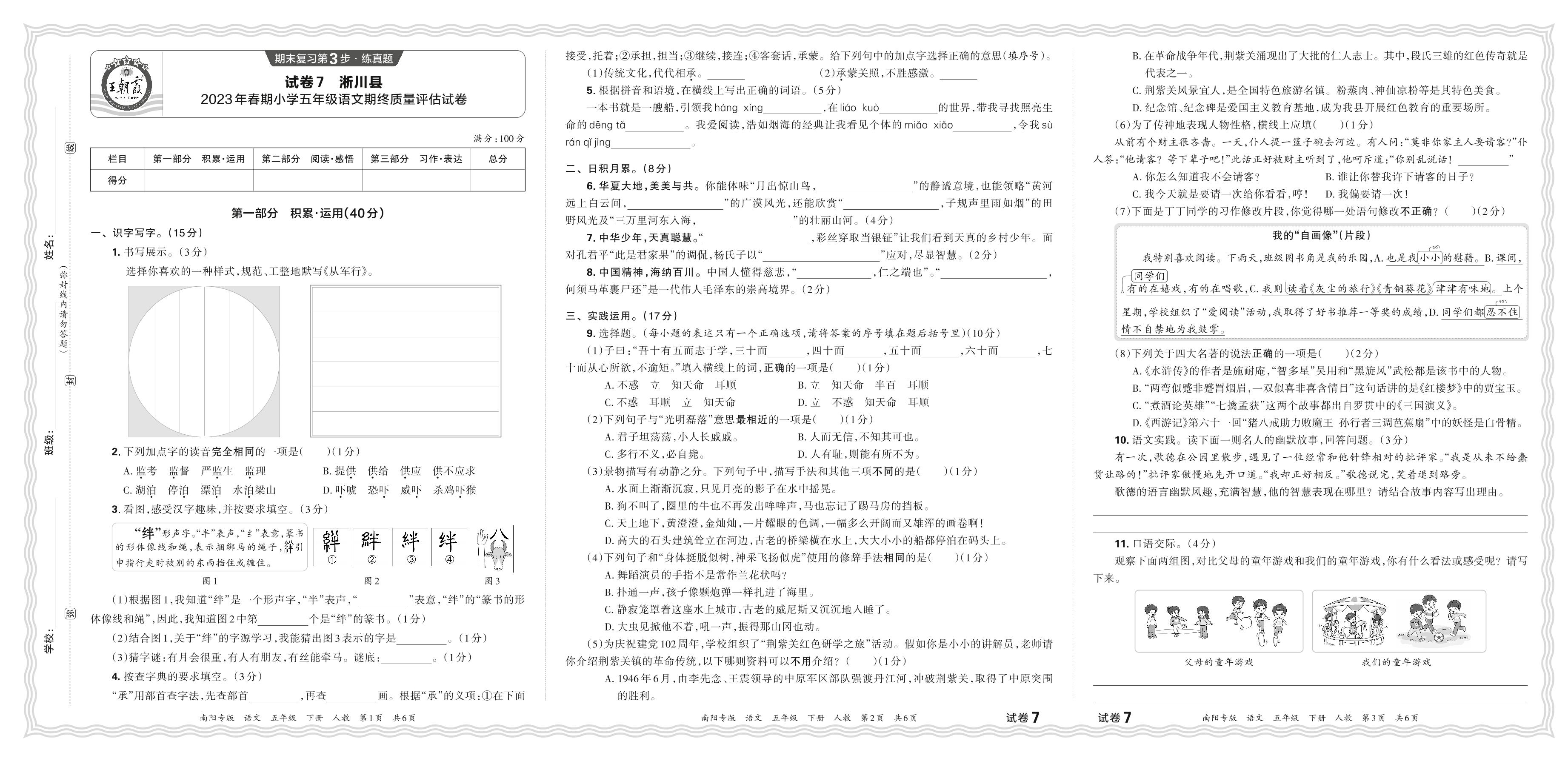 河南省南阳市淅川县2023年春期小学五年级语文期终质量评估试卷(人教版)【7】
