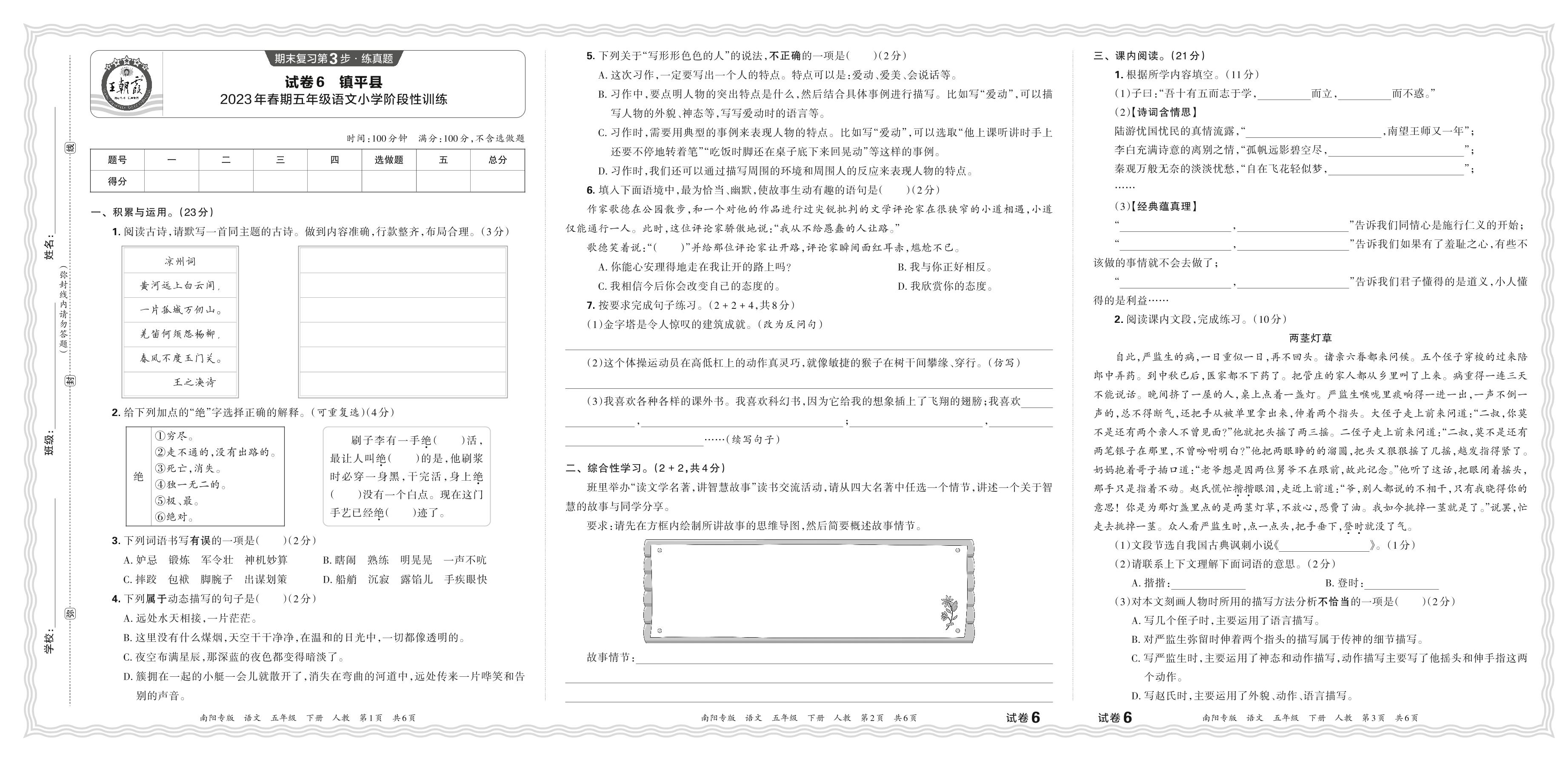 河南省南阳市镇平县2023年春期五年级语文小学阶段性训练(人教版)【6】