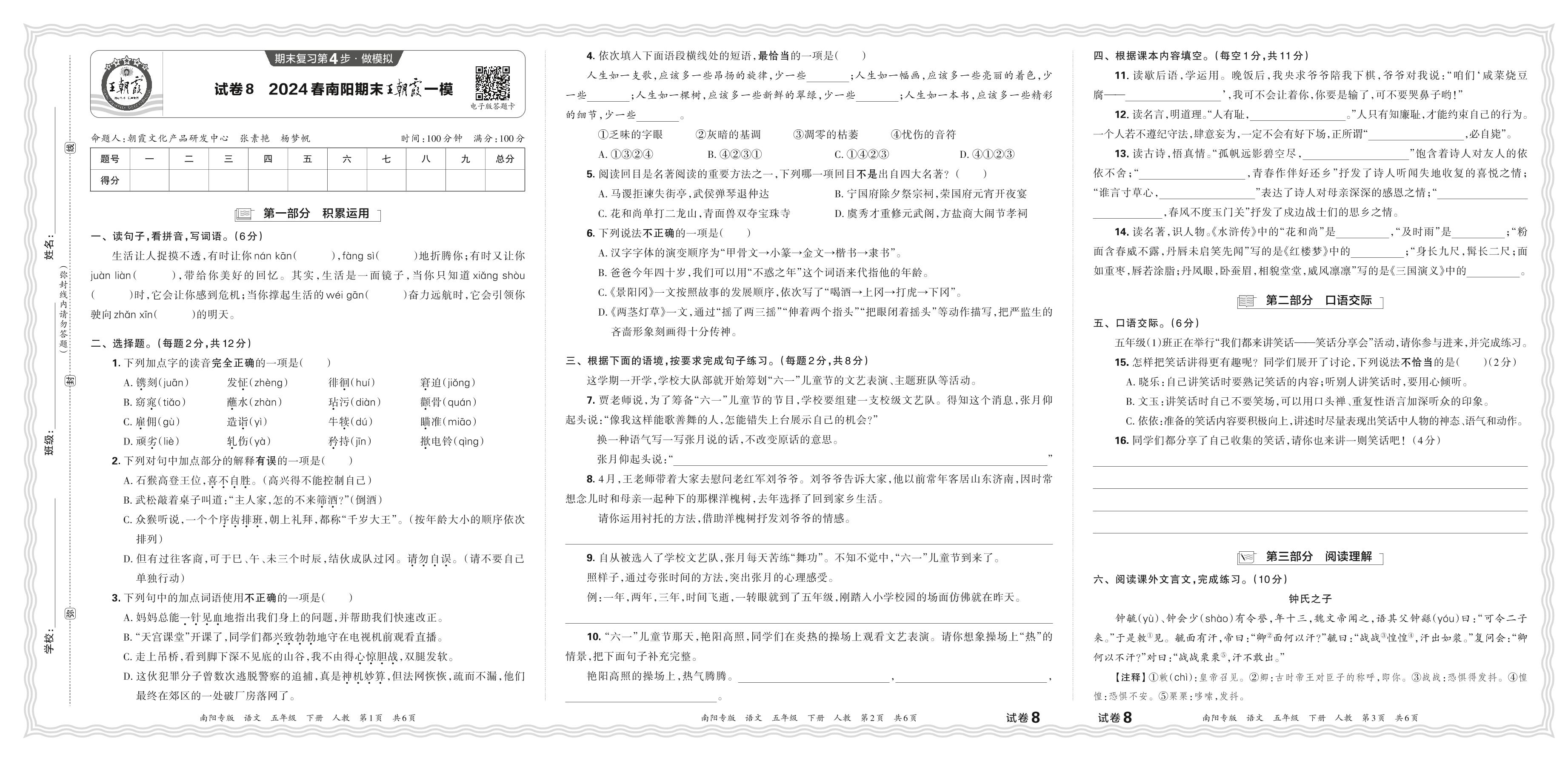 2024春下册五年级语文人教版 河南南阳期末王朝霞一模【8】