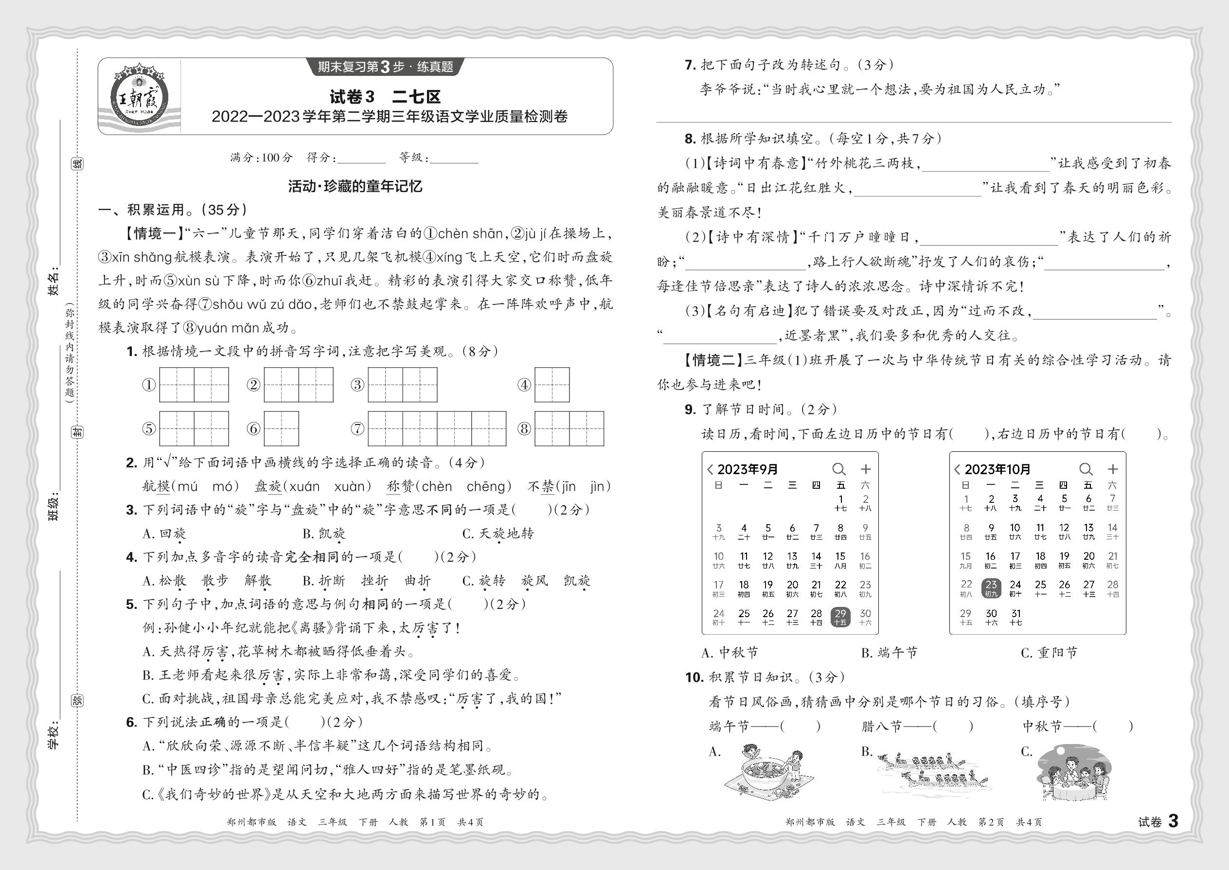 河南省郑州市二七区2022—2023学年第二学期三年级语文学业质量检测卷(人教版)【3】