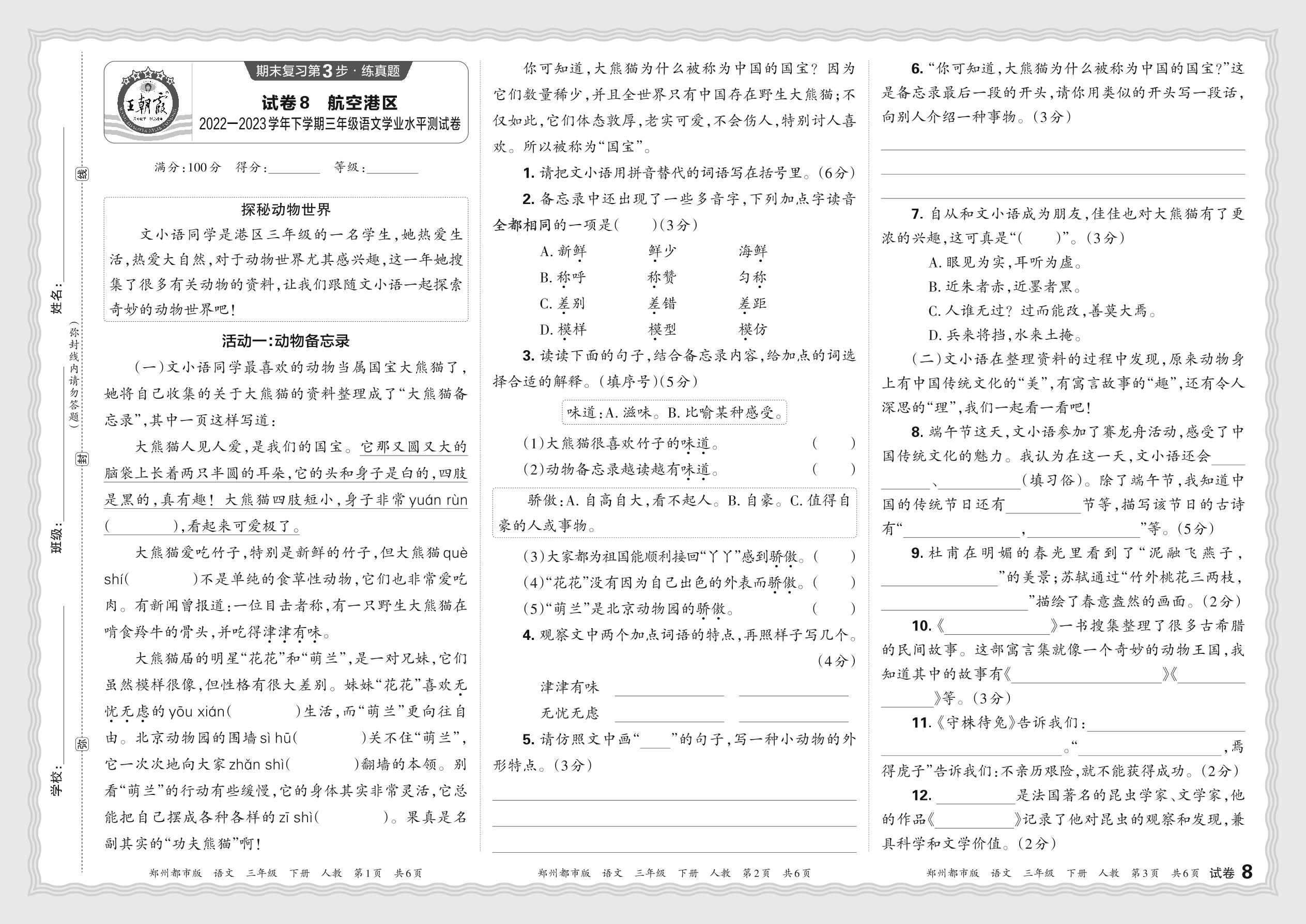 河南省郑州市航空港区2022—2023学年下学期三年级语文学业水平测试卷(人教版)【8】
