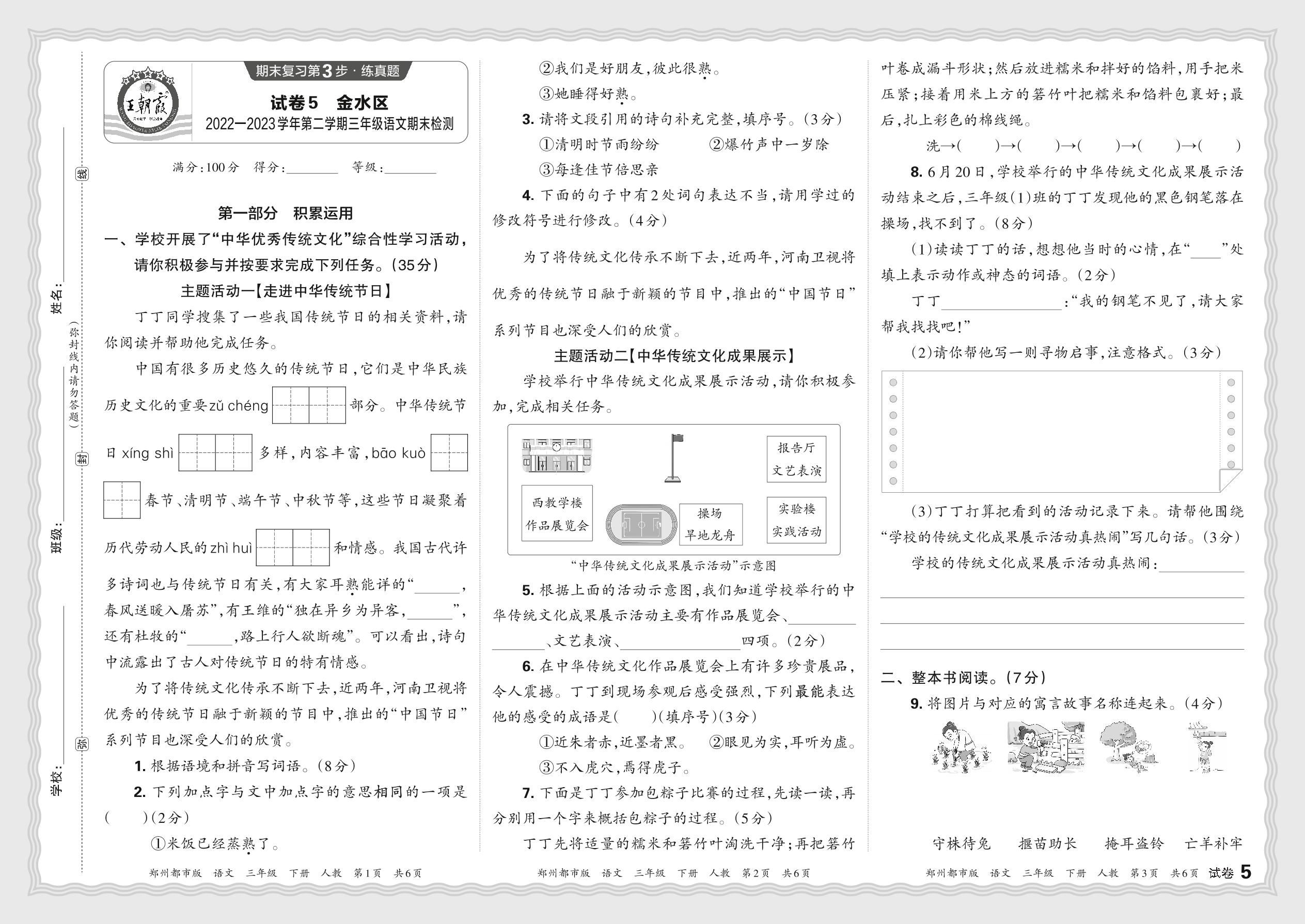 河南省郑州市金水区2022—2023学年下学期三年级语文期末检测(人教版)【5】