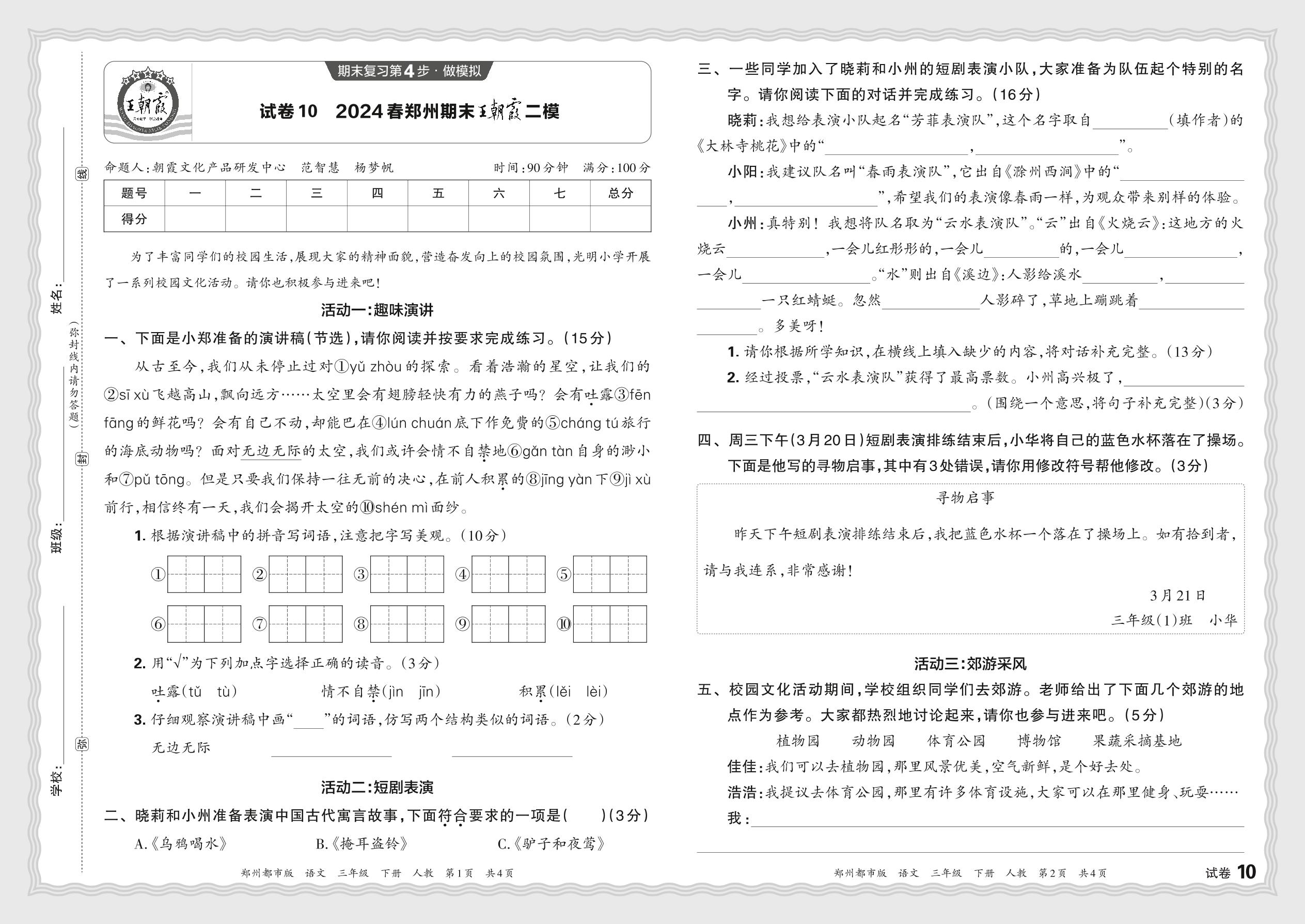 2024春下册三年级语文人教版 河南郑州期末王朝霞二模