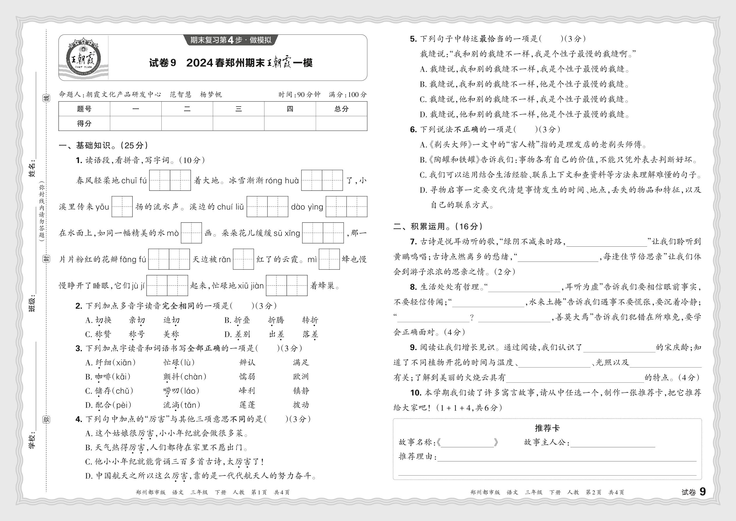 2024春下册三年级语文人教版 河南郑州期末王朝霞一模