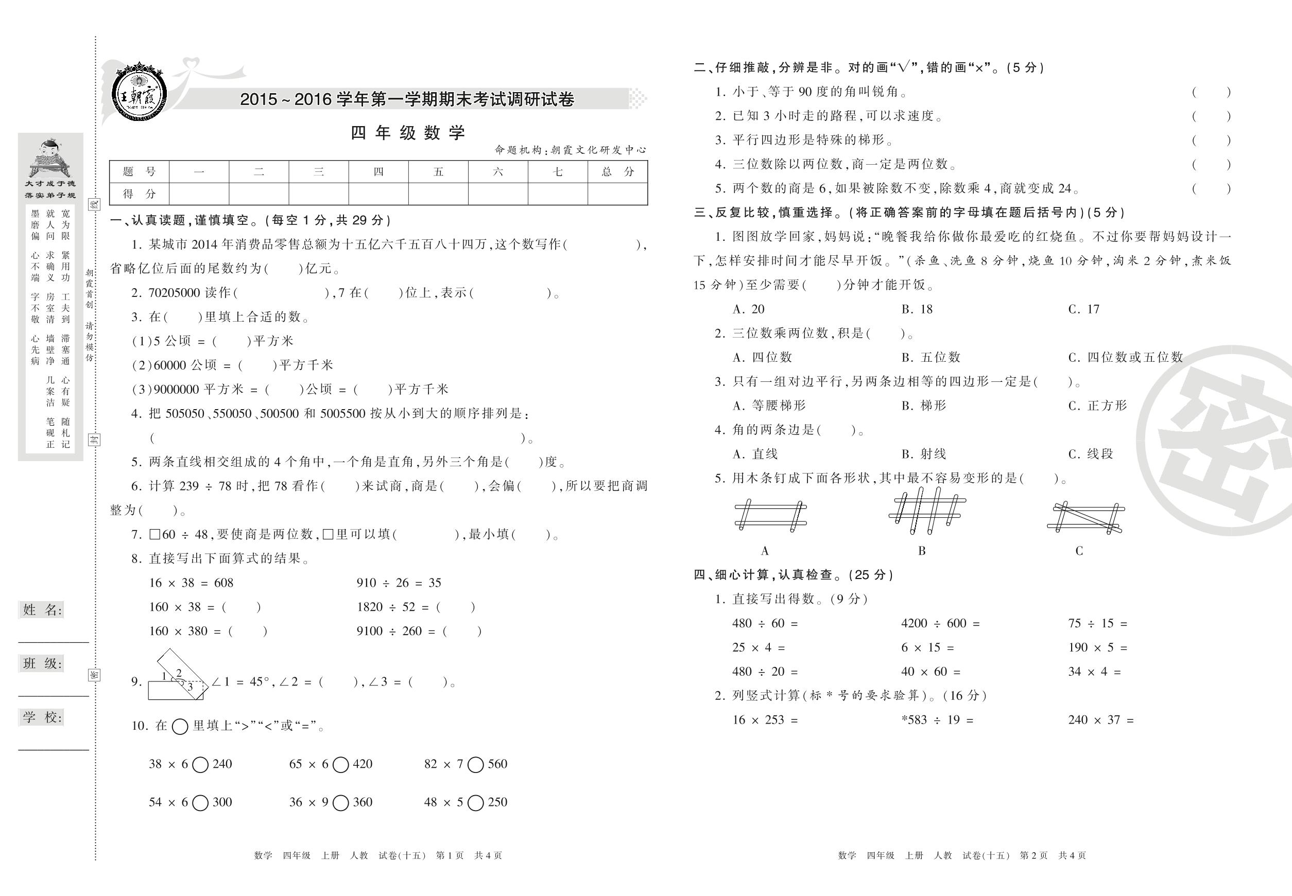 王朝霞期末调研卷四年级上册数学(人教版)【15】