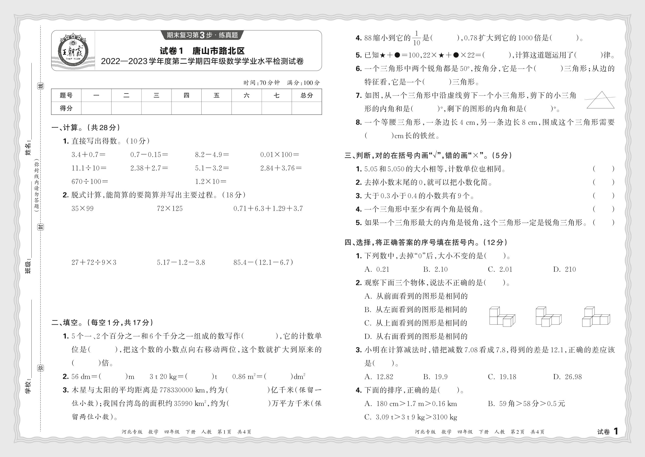 河北省唐山市路北区2022—2023学年度第二学期四年级数学学业水平检测试卷(人教版)【1】
