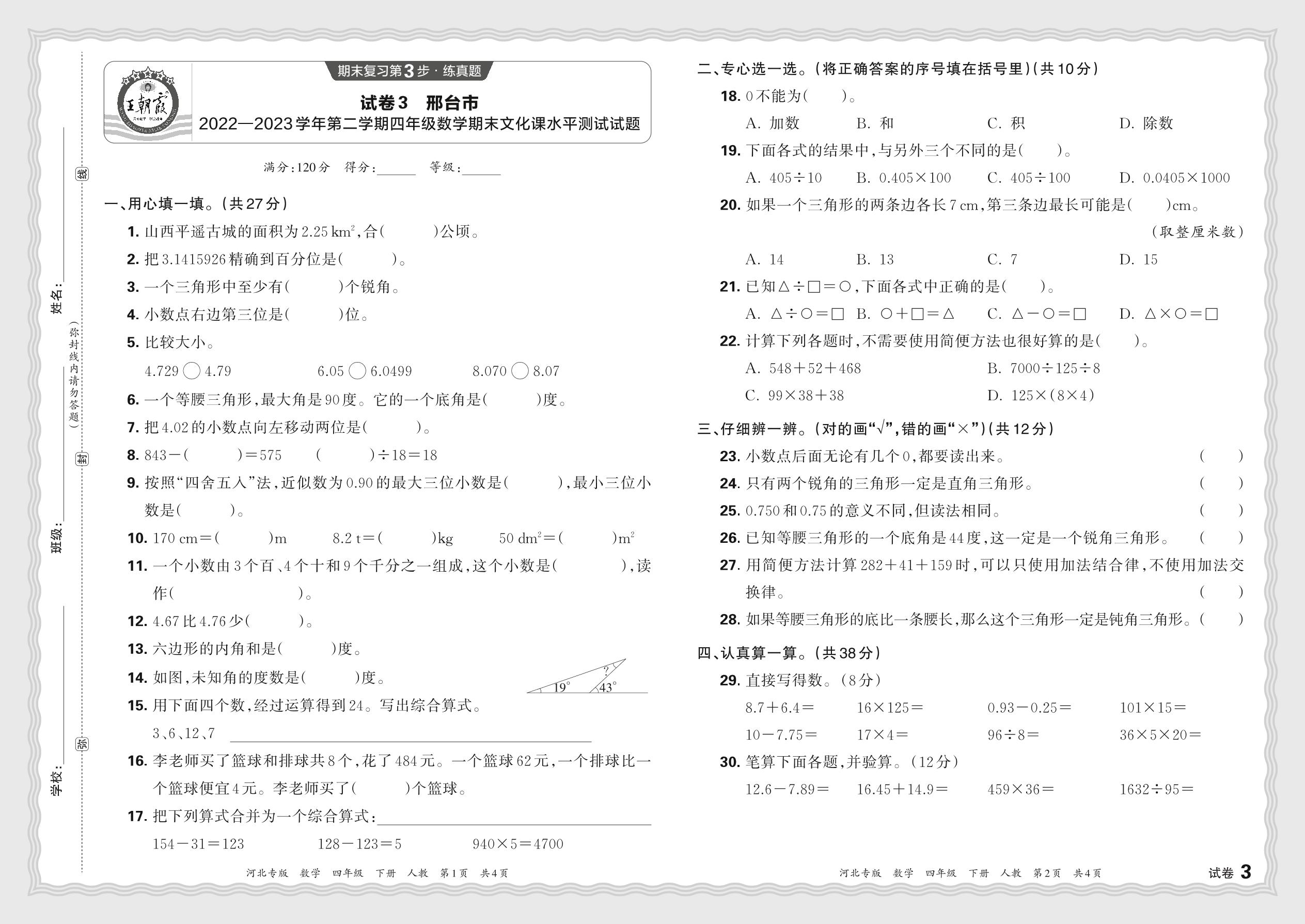 河北省邢台市2022—2023学年第二学期四年级数学期末文化课水平测试试题(人教版)【3】