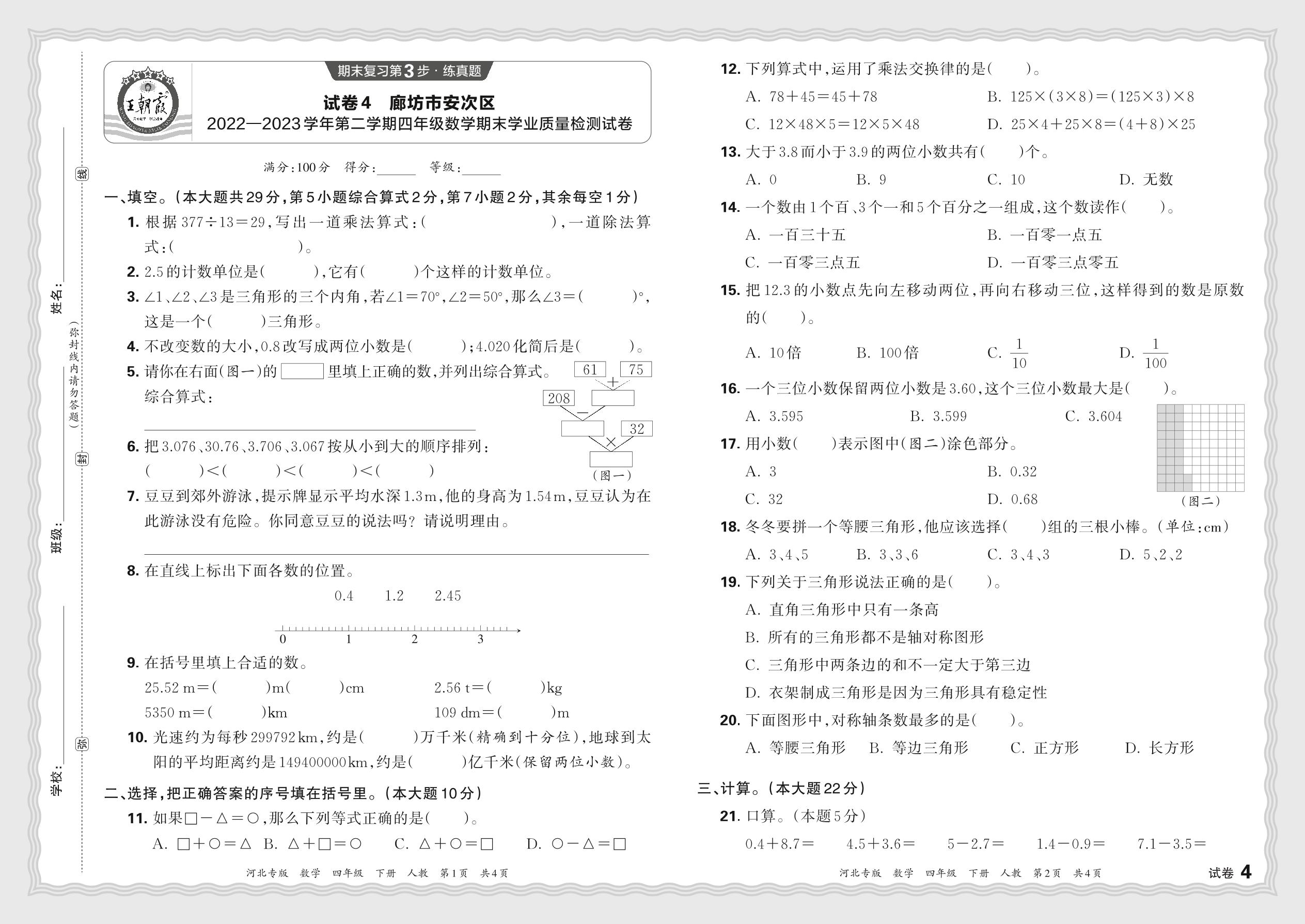 河北省廊坊市安次区2022—2023学年第二学期四年级数学期末学业质量检测试卷(人教版)【4】