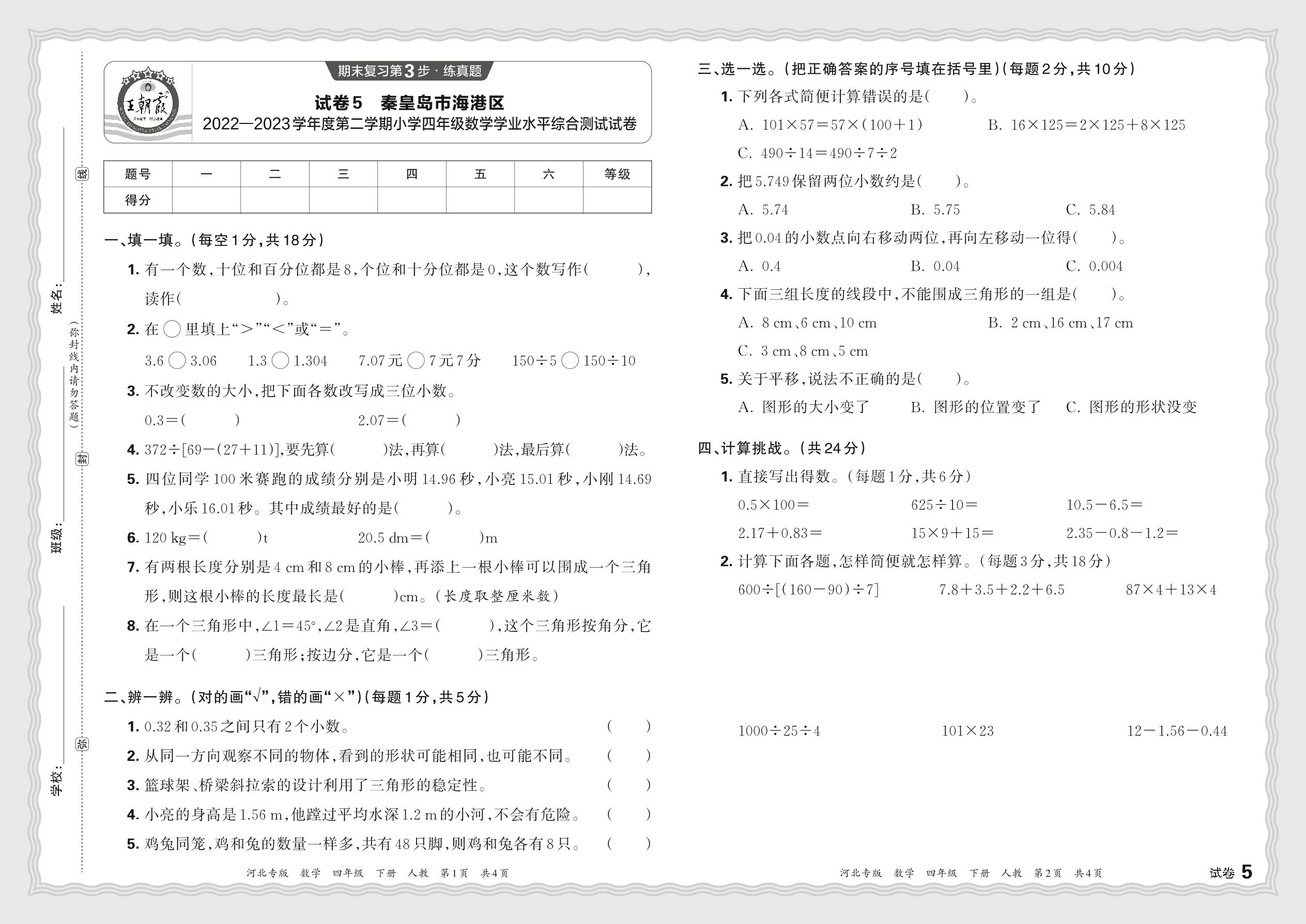 河北省秦皇岛市海港区2022—2023学年度第二学期小学四年级数学学业水平综合测试试卷(人教版)【5】