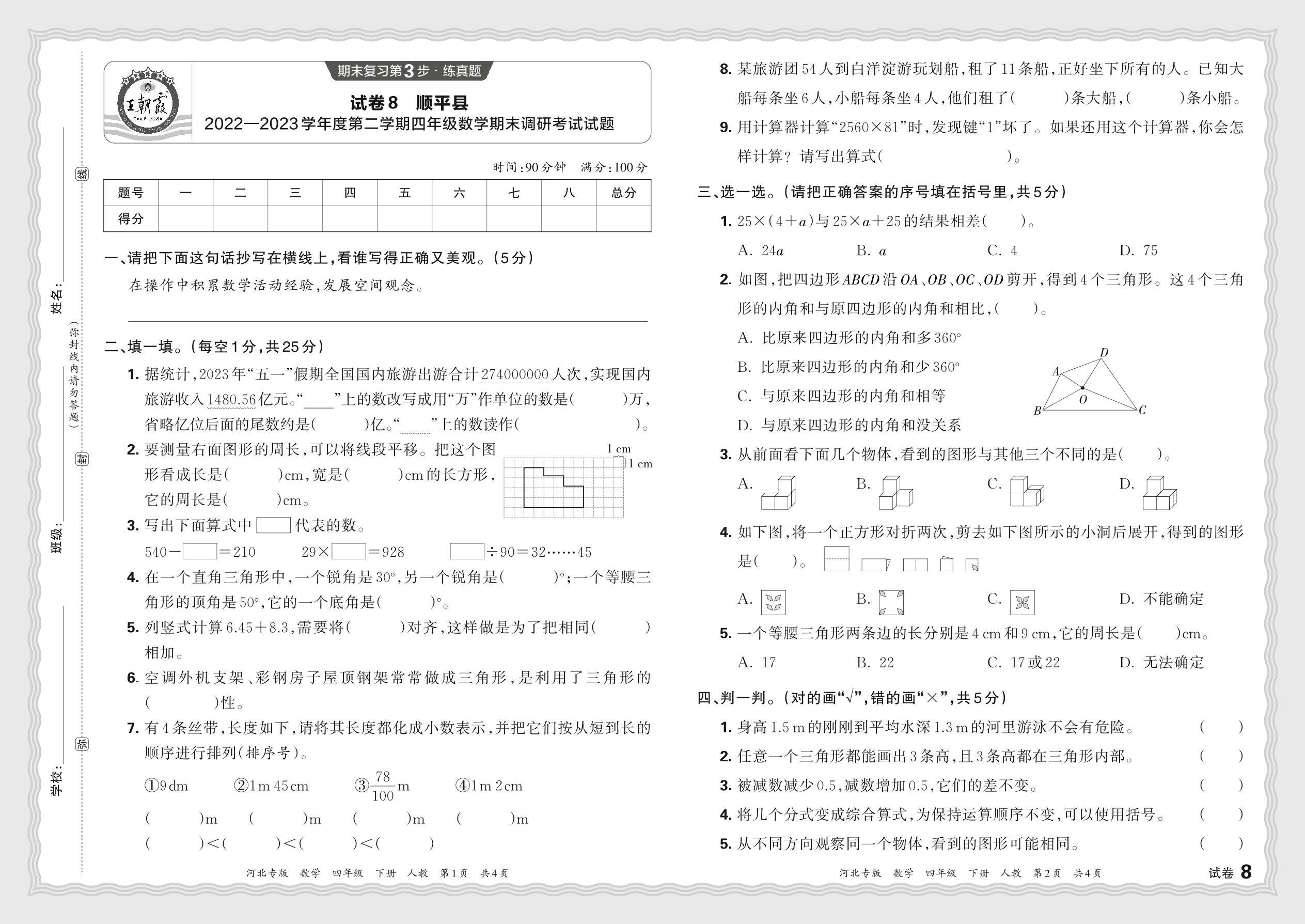 河北省保定市顺平县2022—2023学年度第二学期四年级数学期末调研考试试题(人教版)【8】