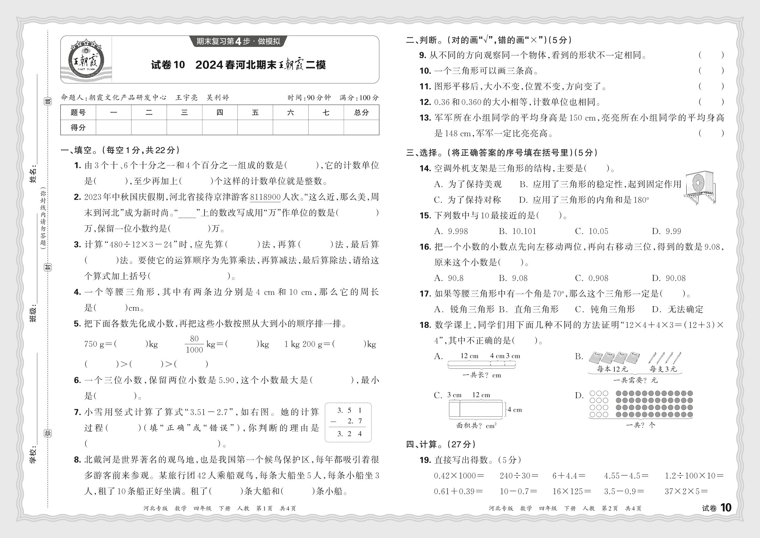 2024春下册四年级数学人教版 河北期末王朝霞二模