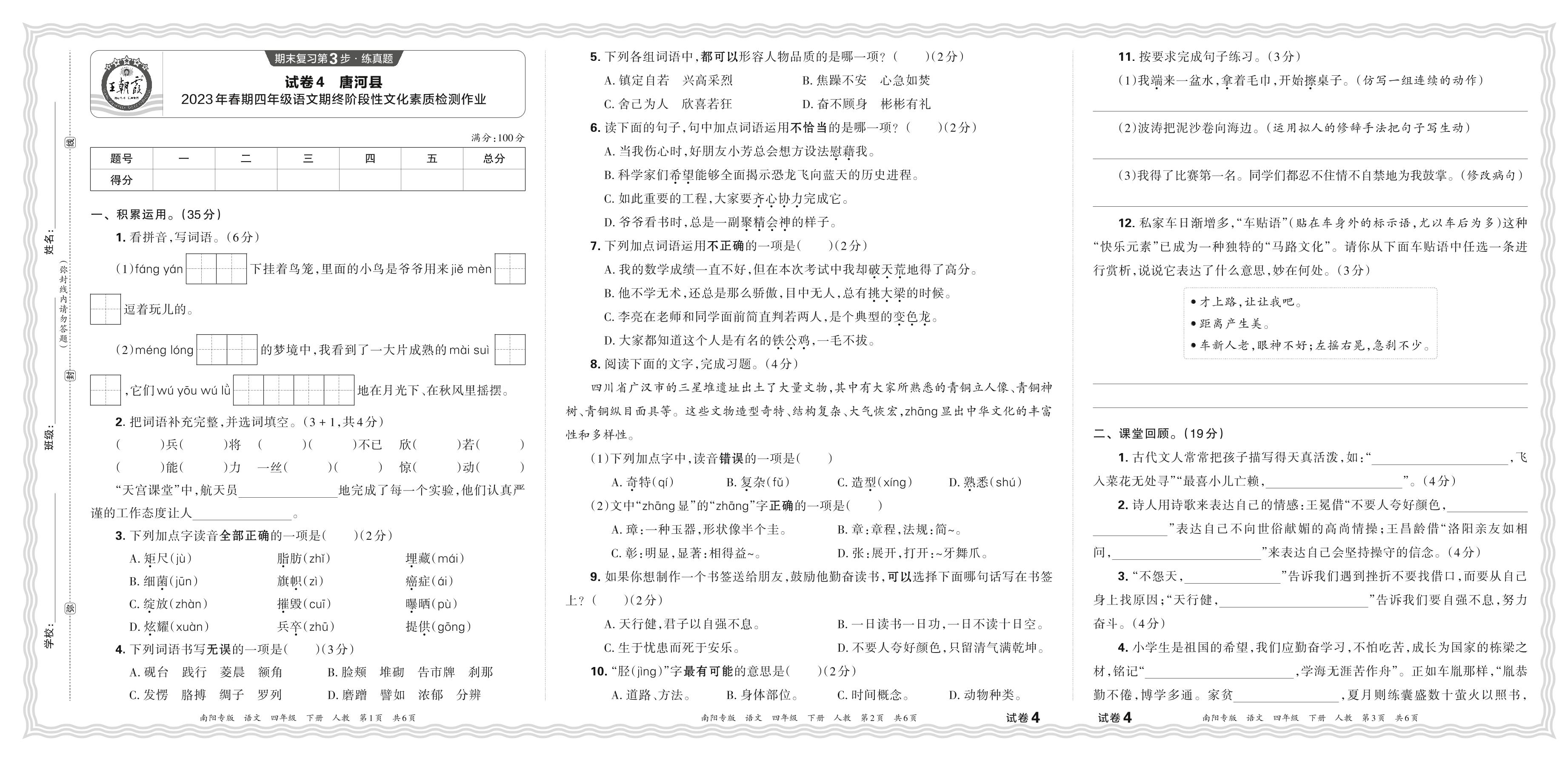 河南省南阳市唐河县2023年春期四年级语文期终阶段性文化素质检测作业(人教版)【4】