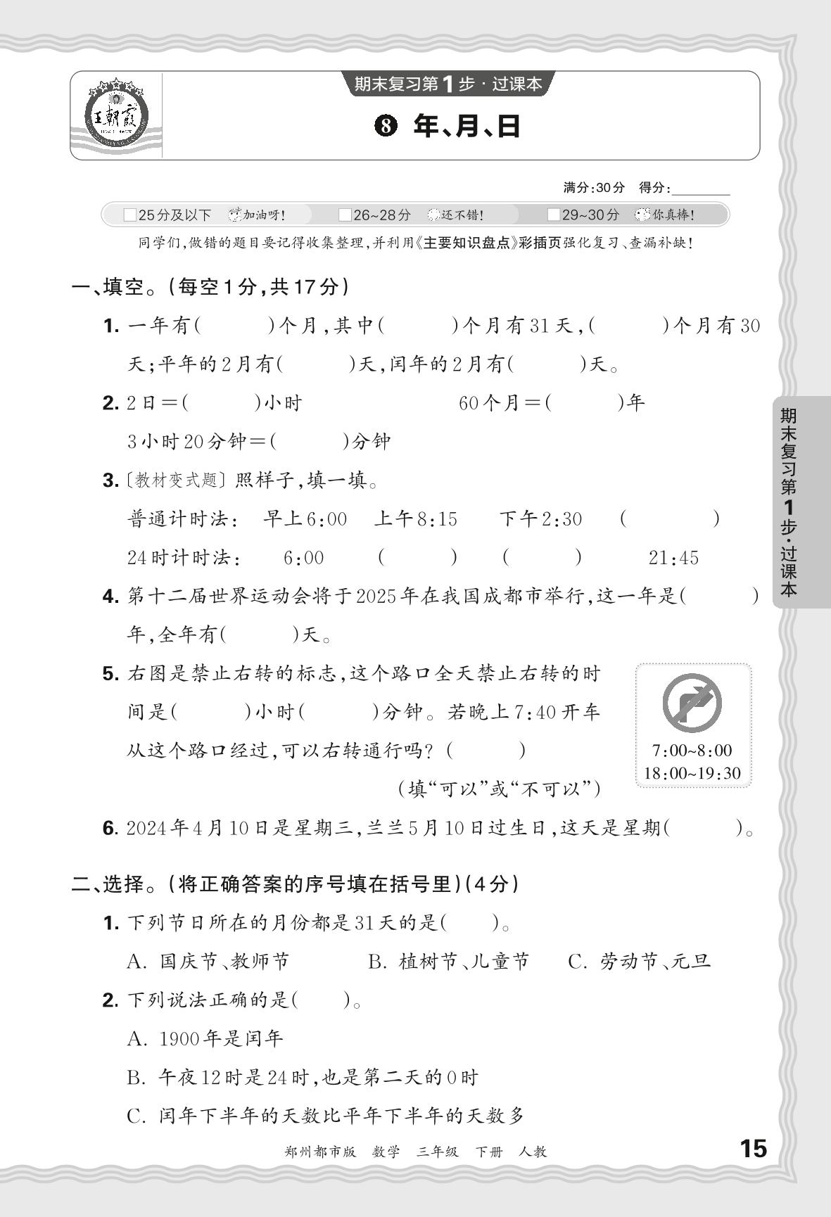 2024春下册三年级数学人教版 期末过课本郑州版·年、月、日【8】