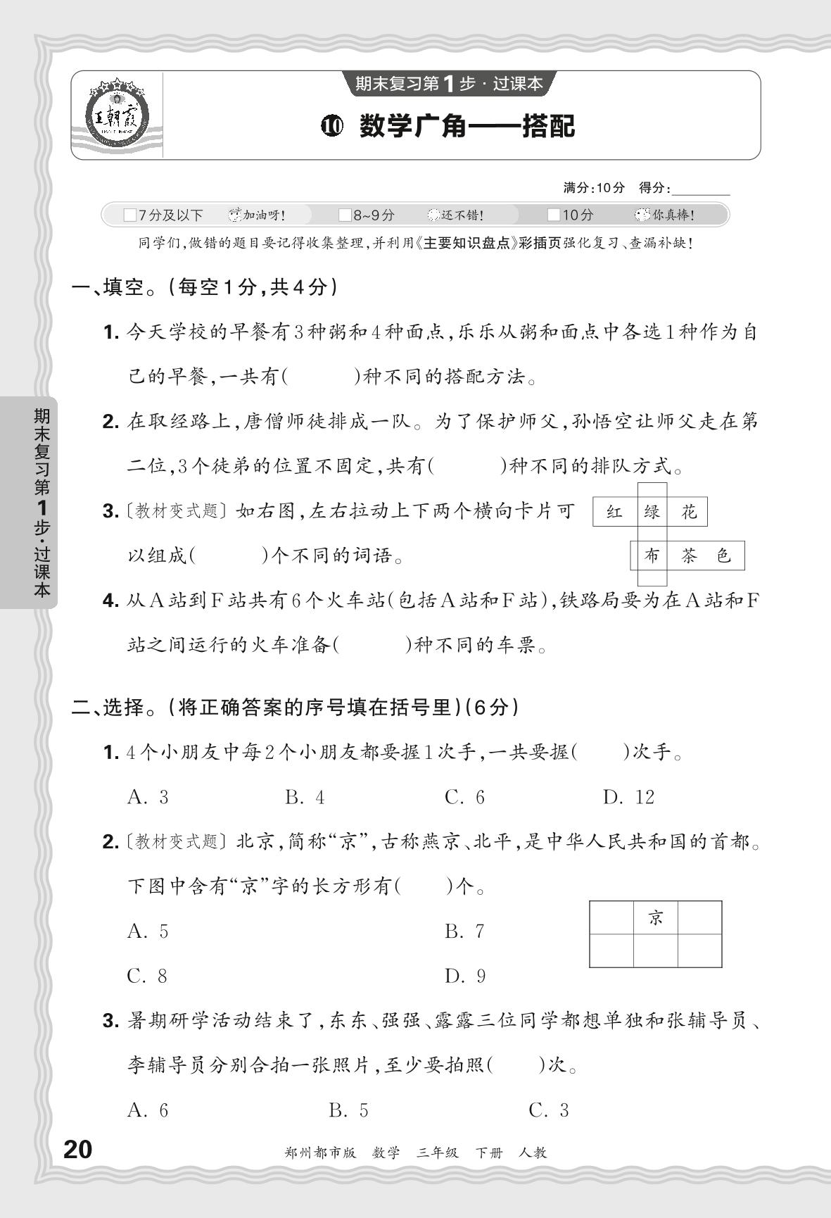 2024春下册三年级数学人教版 期末过课本郑州版·数学广角——搭配【10】