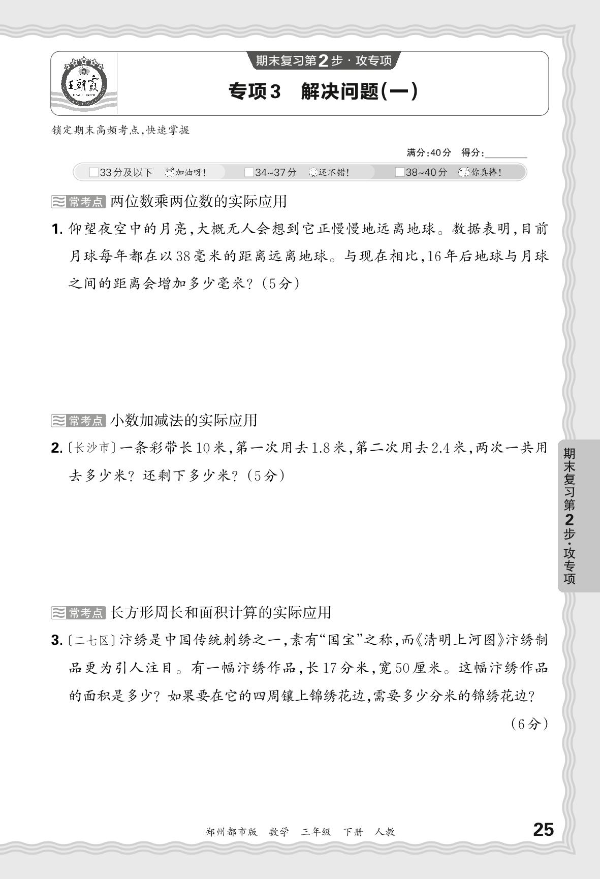 2024春下册三年级数学人教版 期末专项卷郑州版·解决问题(一)【3】