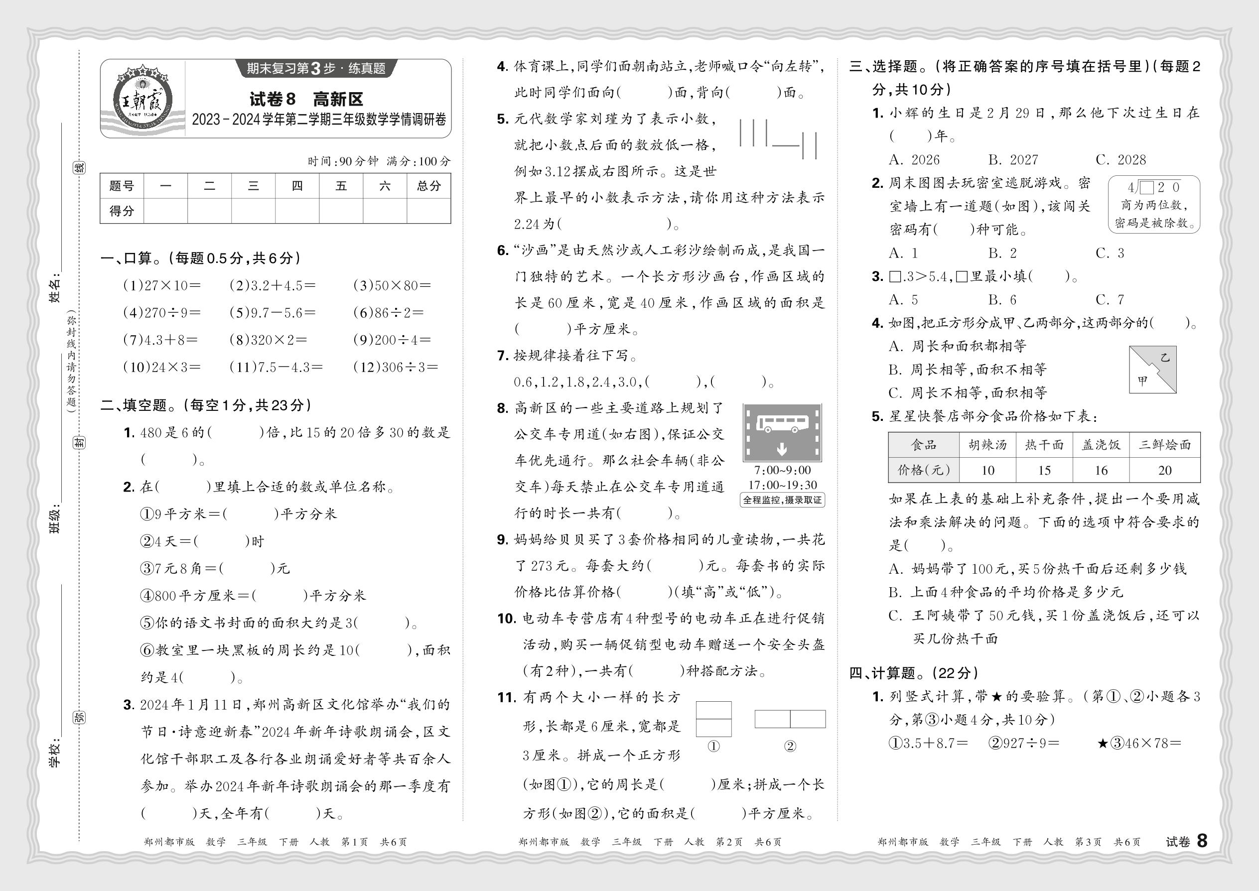 河南省郑州市高新区2023—2024学年第二学期三年级数学学情调研卷(人教版)【8】