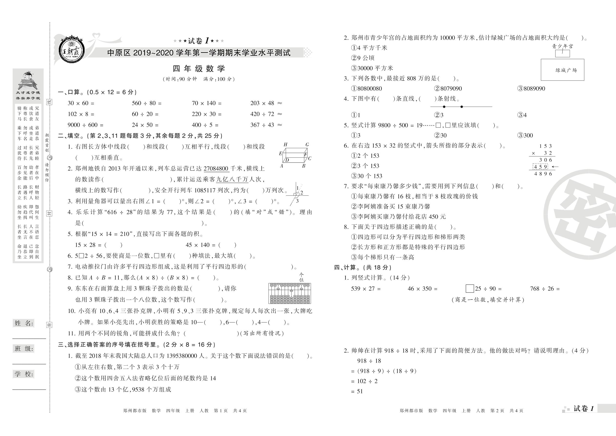 2019-2020学年第一学期郑州市中原区四年级数学试卷(人教版)_R210804142048【1】