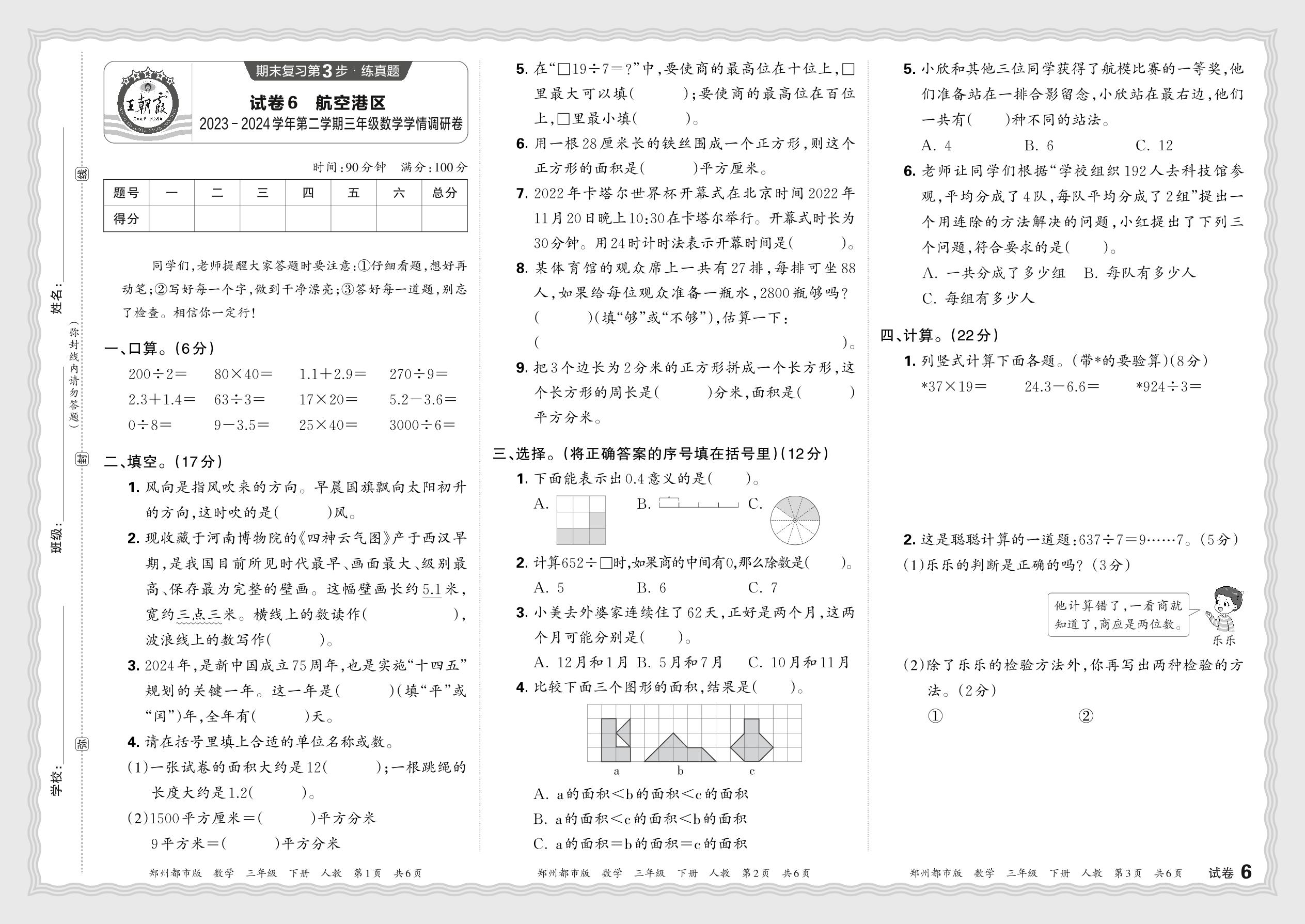 河南省郑州市航空港区2023—2024学年第二学期三年级数学学情调研卷(人教版)【6】