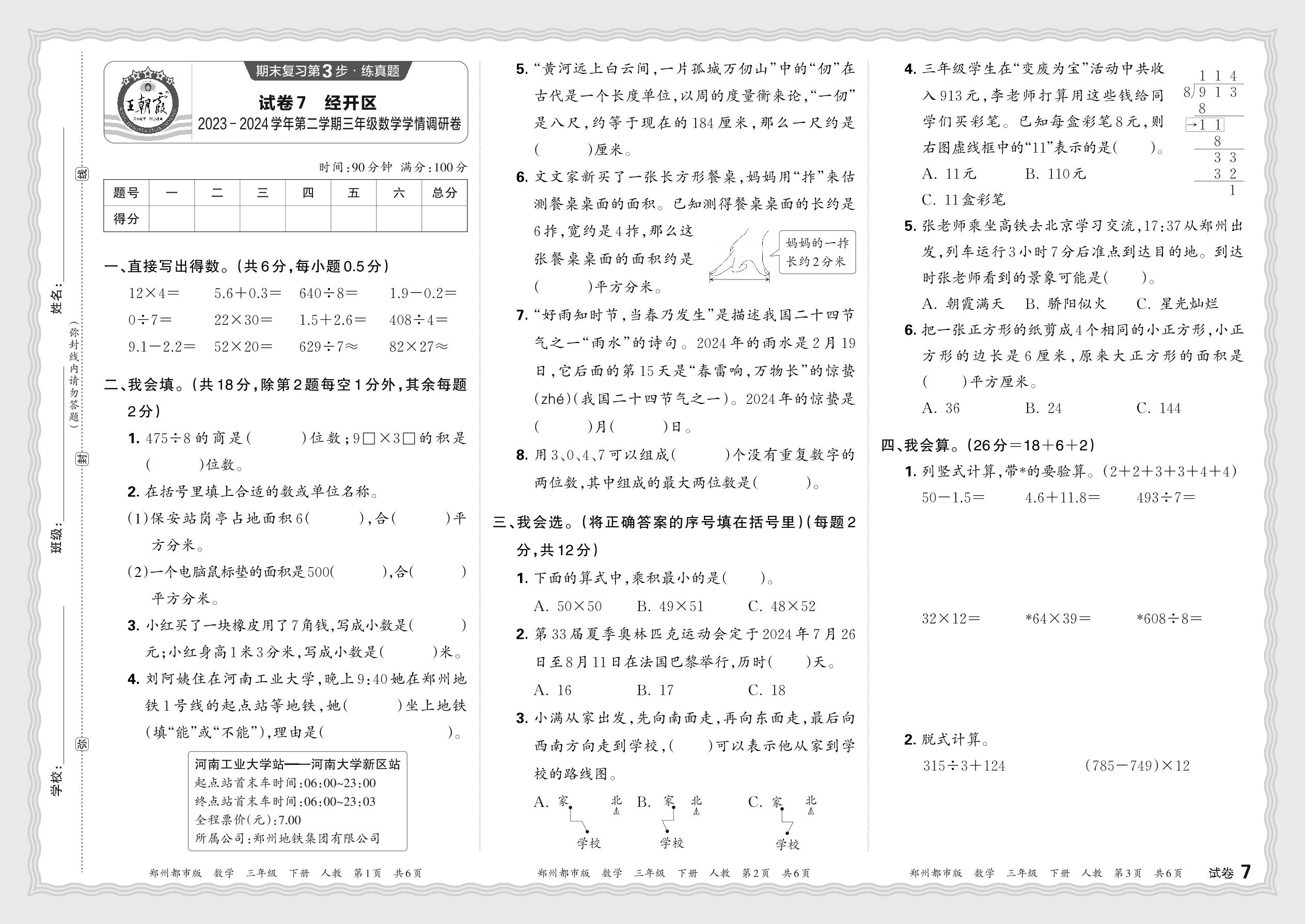 河南省郑州市经开区2023—2024学年第二学期三年级数学学情调研卷(人教版)【7】