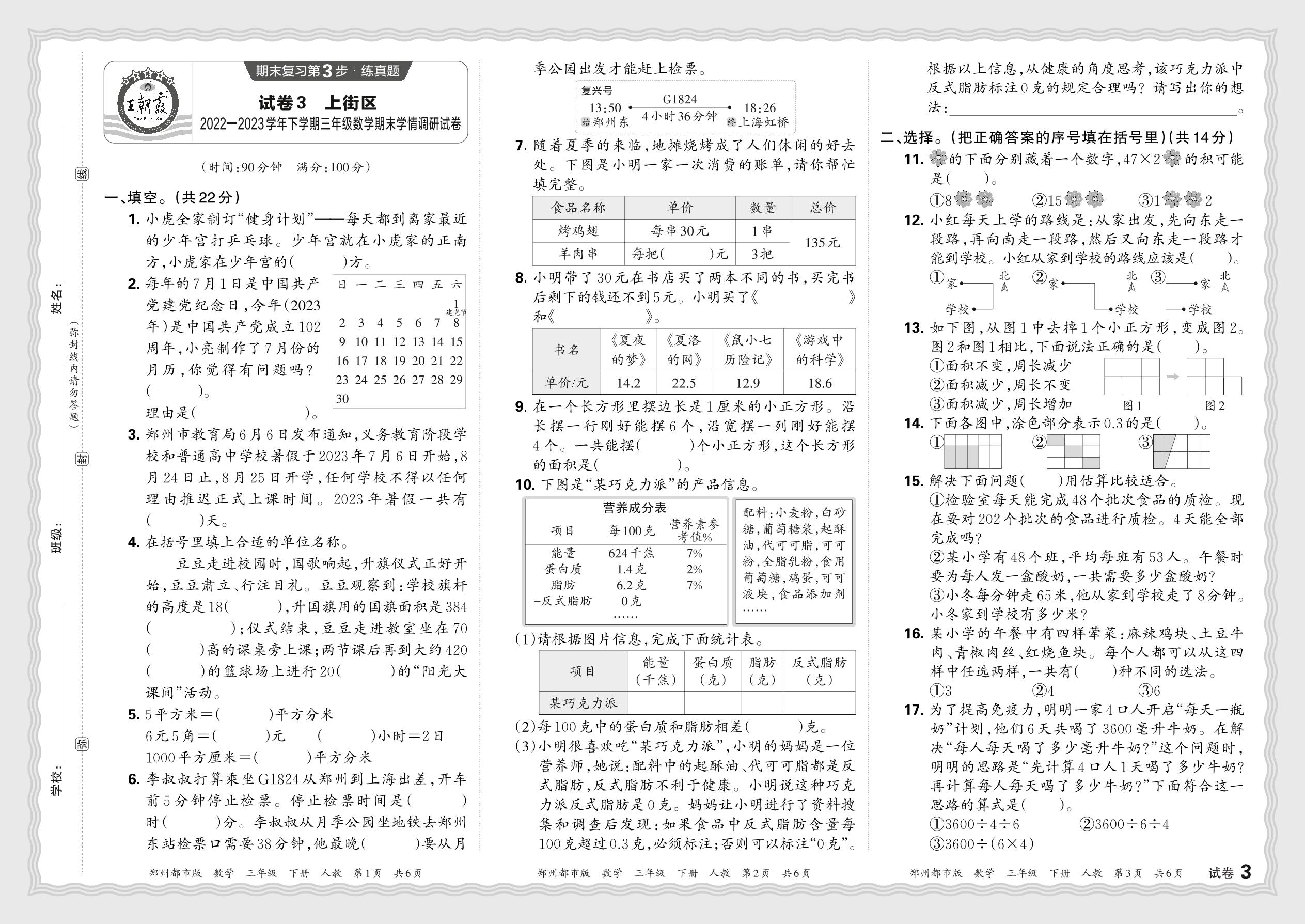 河南省郑州市上街区2022—2023学年下学期三年级数学期末学情调研试卷(人教版)【3】