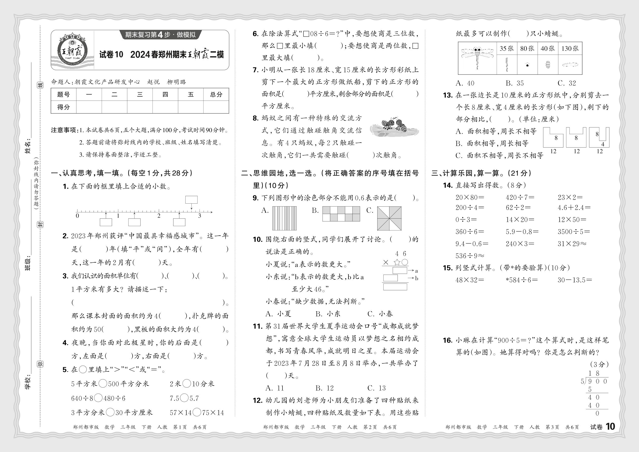2024春下册三年级数学人教版 河南郑州期末王朝霞二模