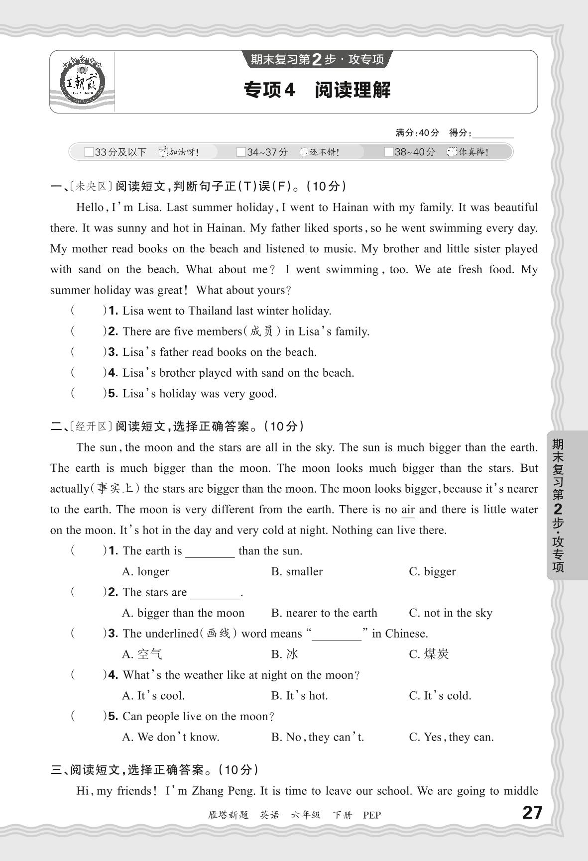 2024春下册六年级英语人教PEP版 期末专项卷西安版·阅读理解【4】