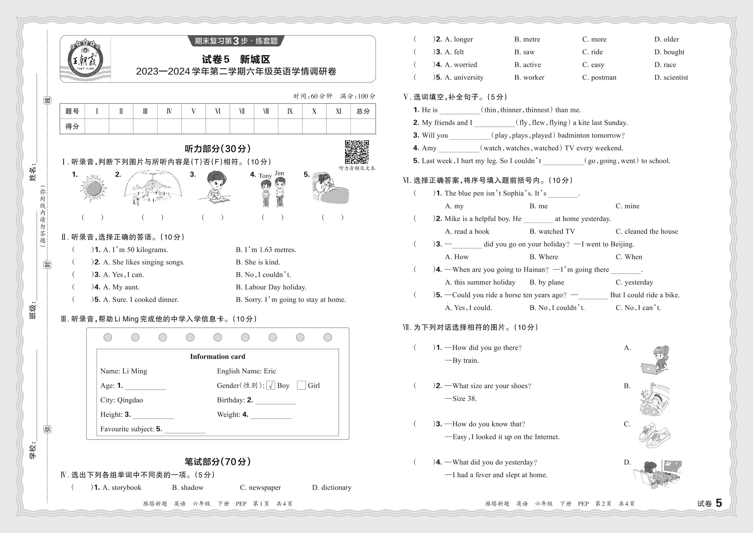 陕西省西安市新城区2023—2024学年第二学期六年级英语学情调研卷(人教PEP版)【5】