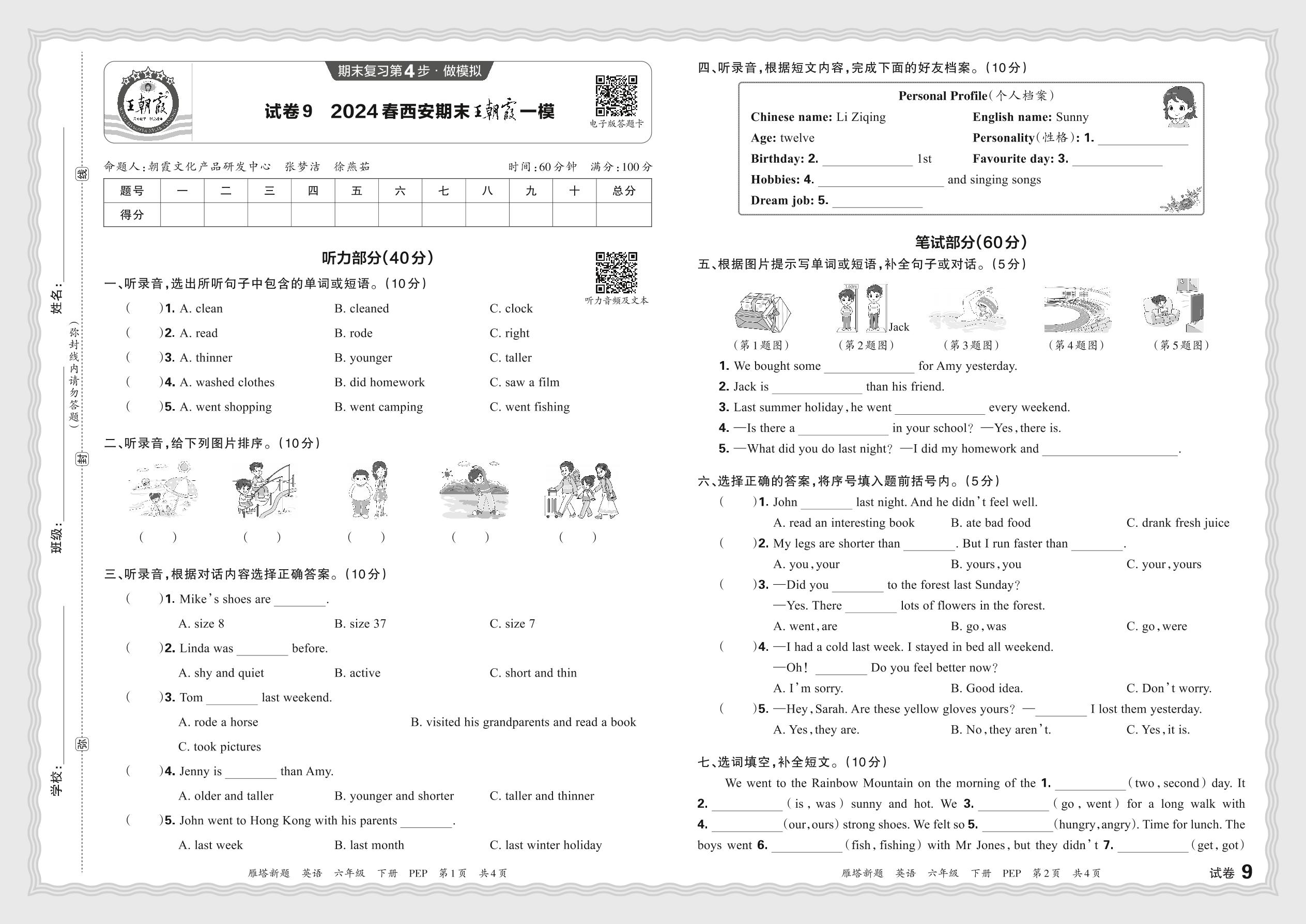2024春下册六年级英语人教PEP版 陕西西安期末王朝霞一模