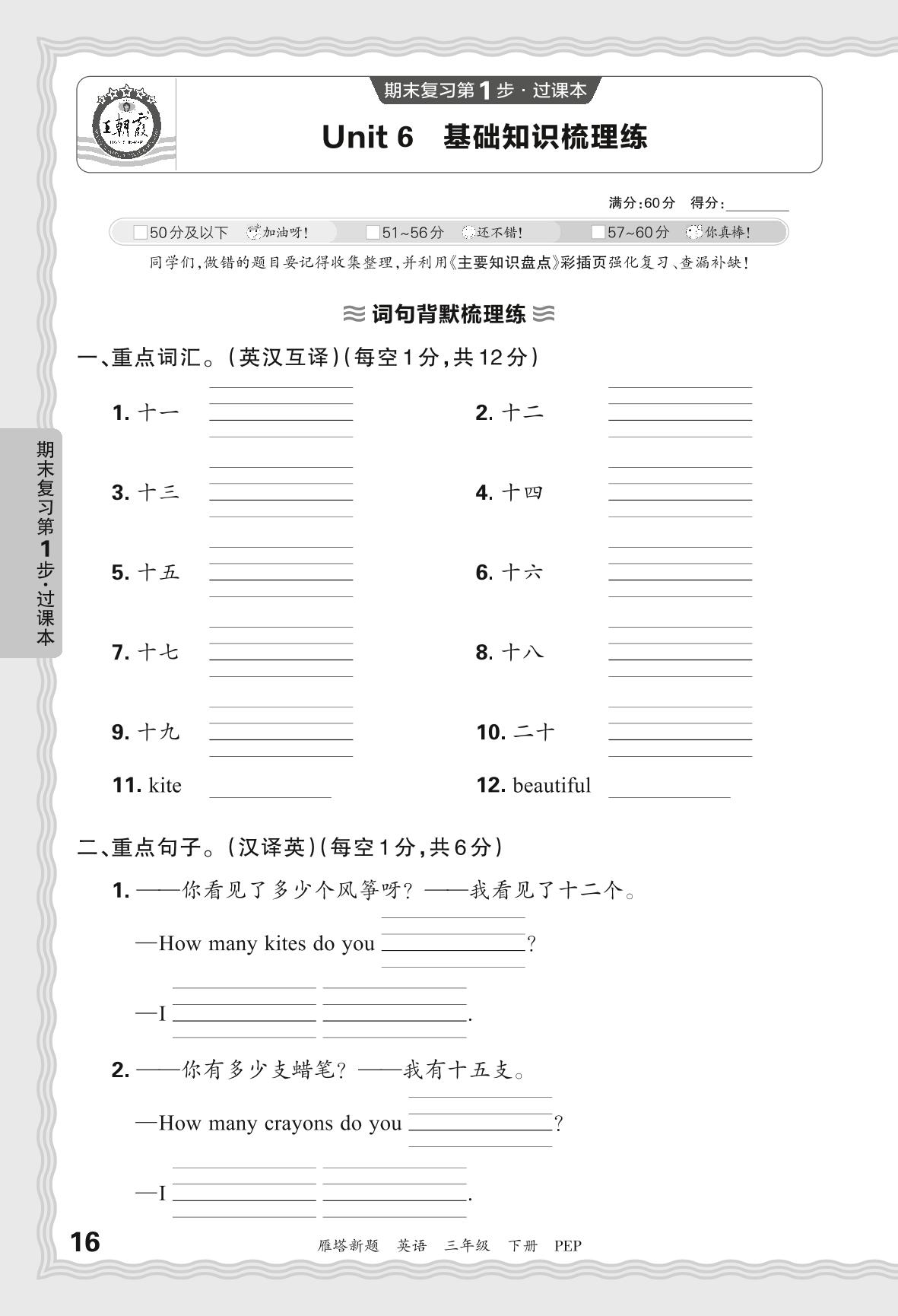 2024春下册三年级英语人教PEP版 期末过课本西安版·Unit 6 基础知识梳理练