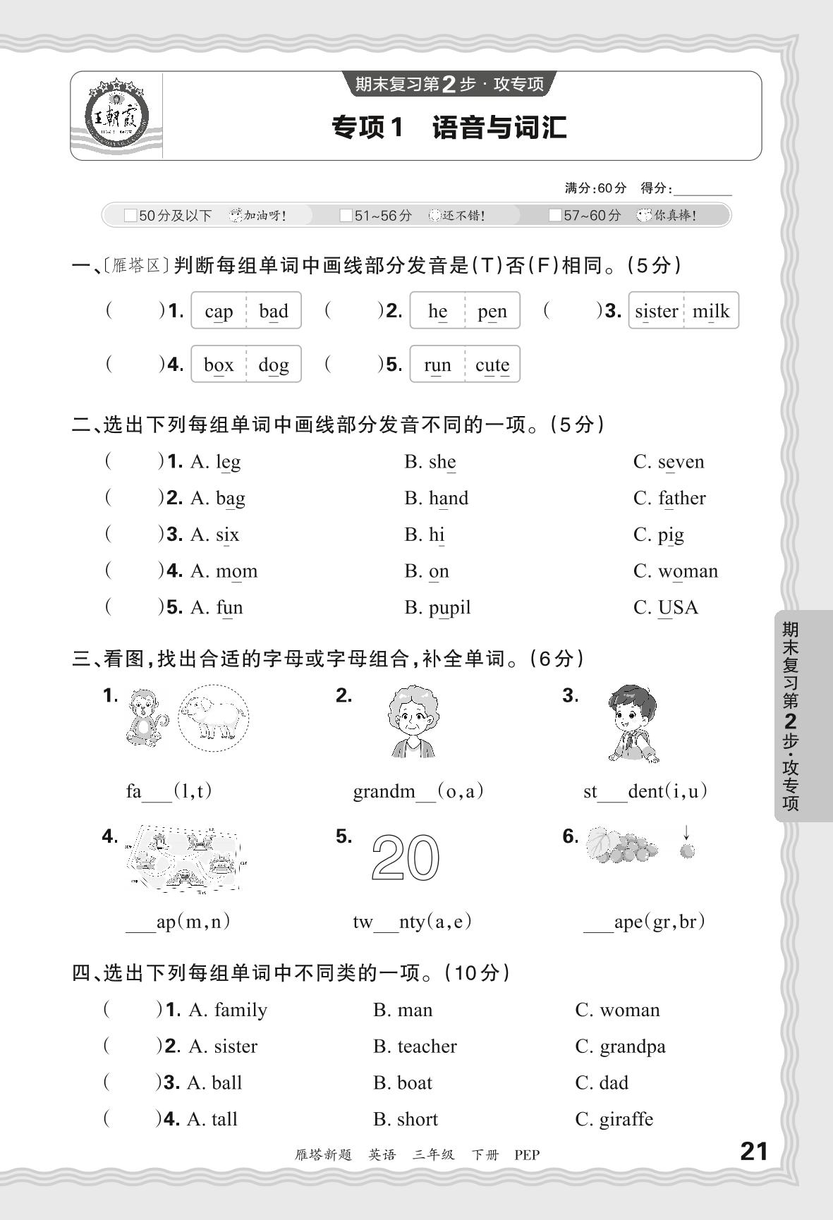 2024春下册三年级英语人教PEP版 期末专项卷西安版·语音与词汇【1】