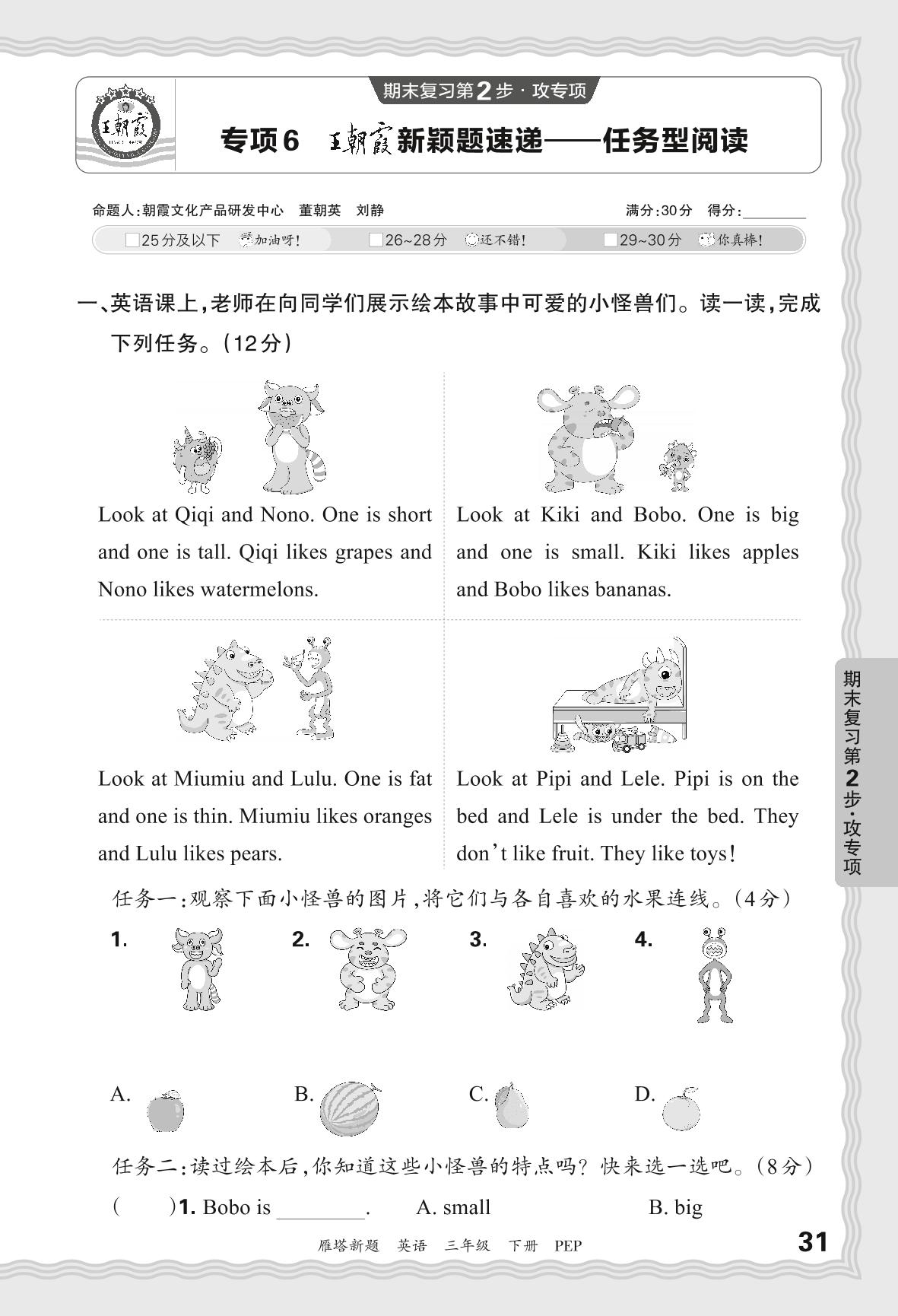 2024春下册三年级英语人教PEP版 期末专项卷西安版·王朝霞新颖题速递——任务型阅读【6】