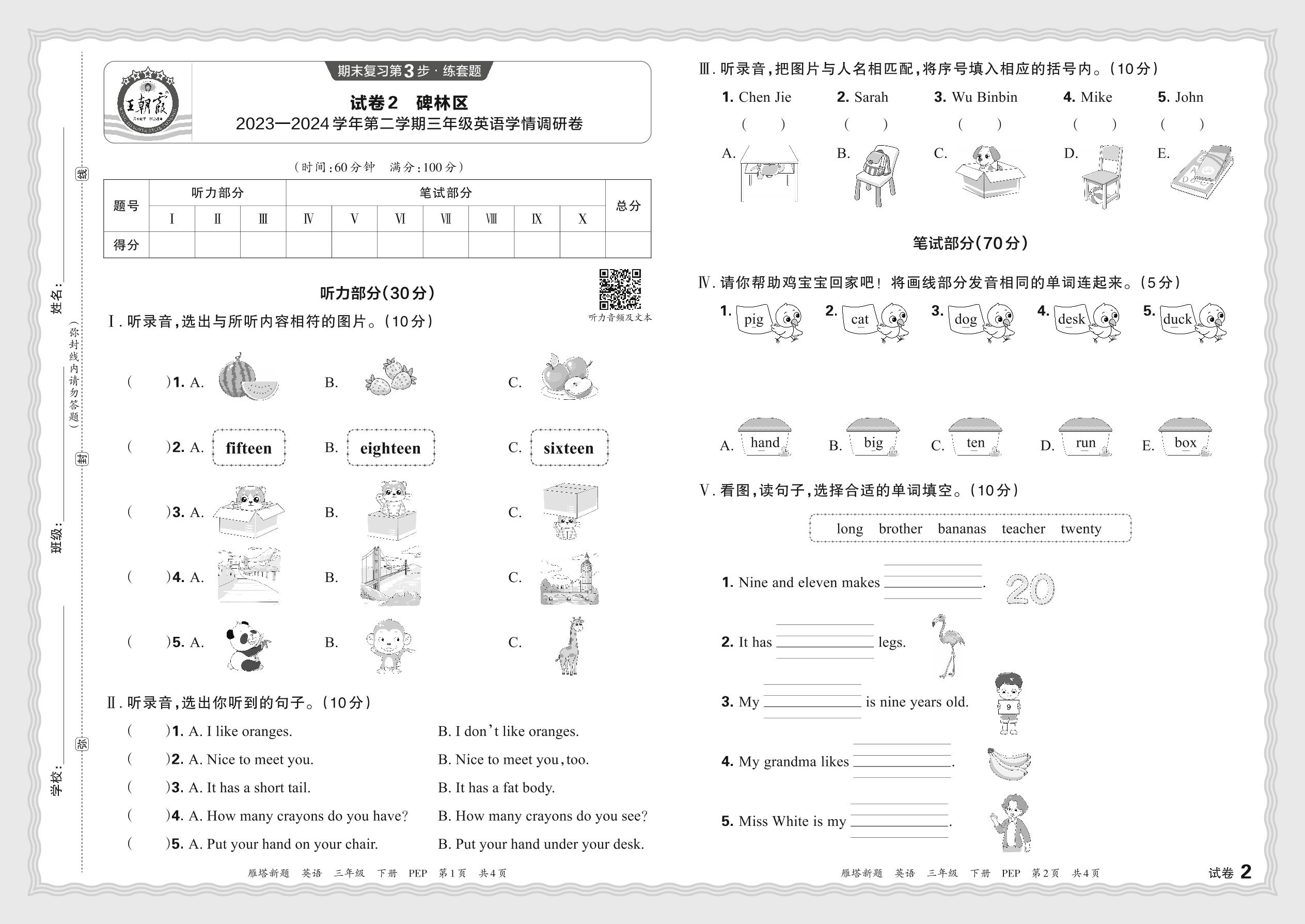 陕西省西安市碑林区2023—2024学年第二学期三年级英语学情调研卷(人教PEP版)【2】