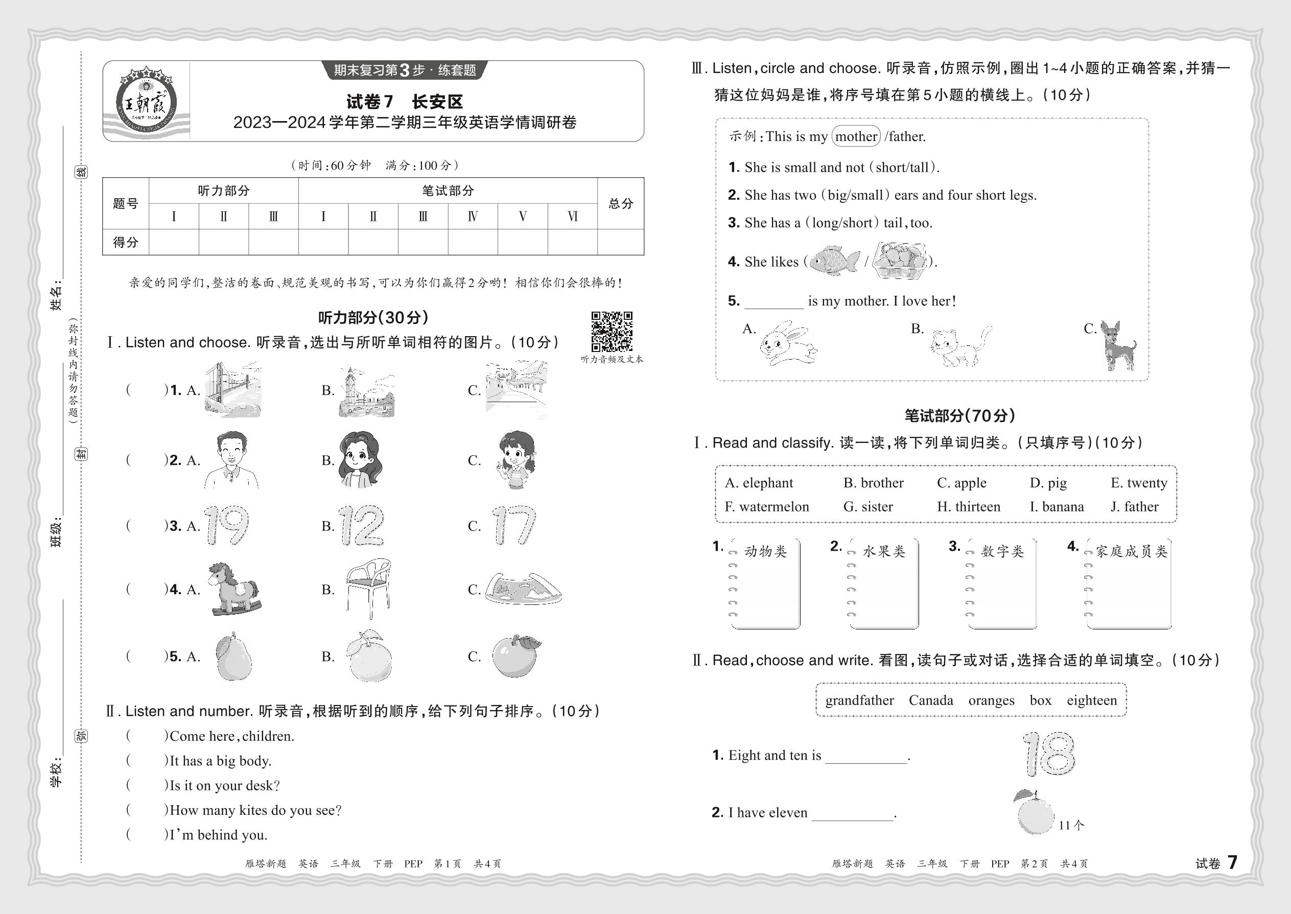 陕西省西安市长安区2023—2024学年第二学期三年级英语学情调研卷(人教PEP版)【7】