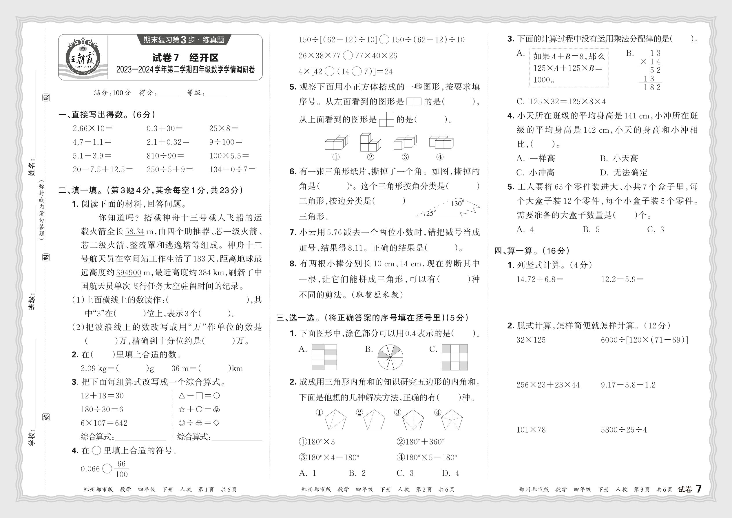 河南省郑州市经开区2023—2024学年第二学期四年级数学学情调研卷(人教版)【7】