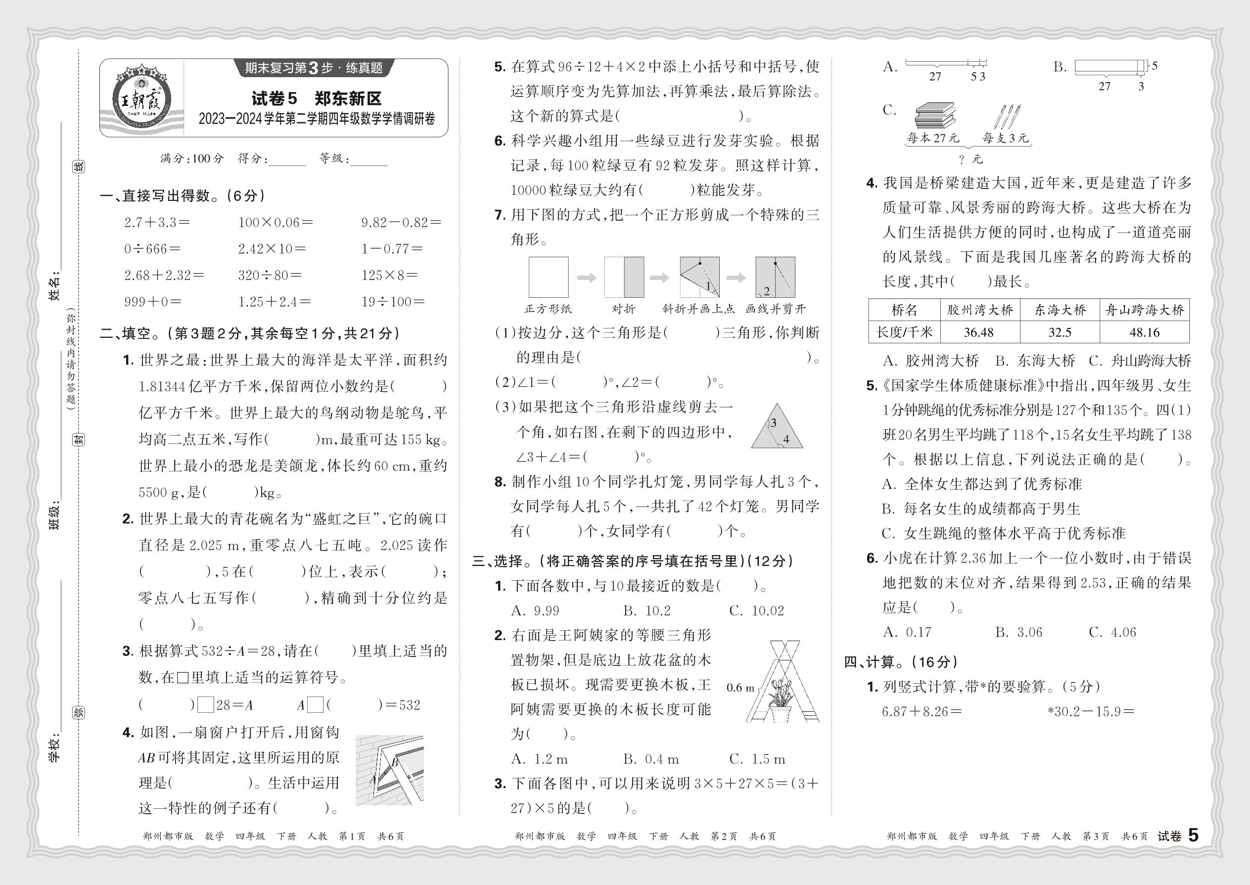 河南省郑州市郑东新区2023-2024学年第二学期四年级数学学情调研卷(人教版)【5】