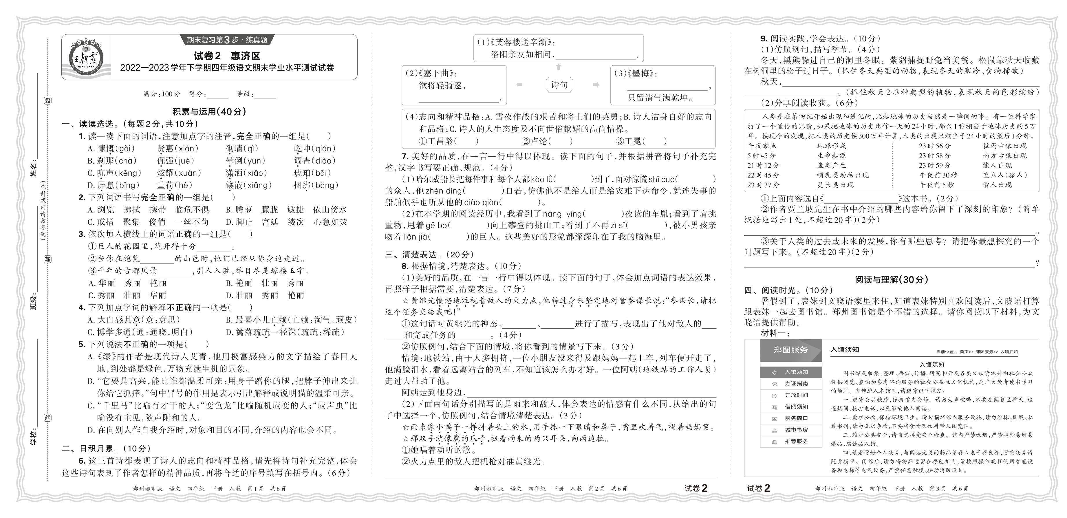 河南省郑州市惠济区2022—2023学年下学期四年级语文期末学业水平测试试卷(人教版)【2】