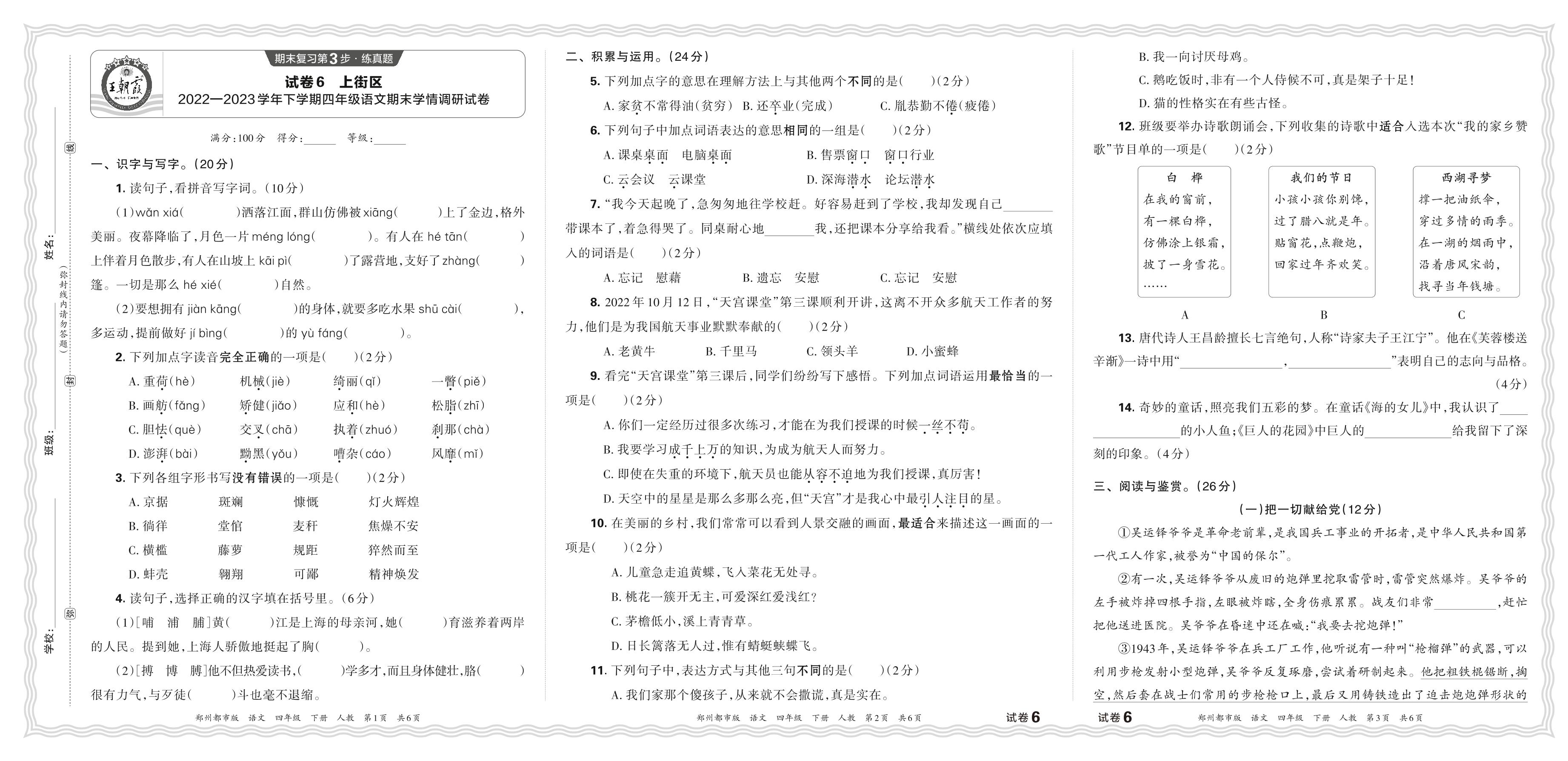 河南省郑州市上街区2022—2023学年下学期四年级语文期末学情调研试卷(人教版)【6】