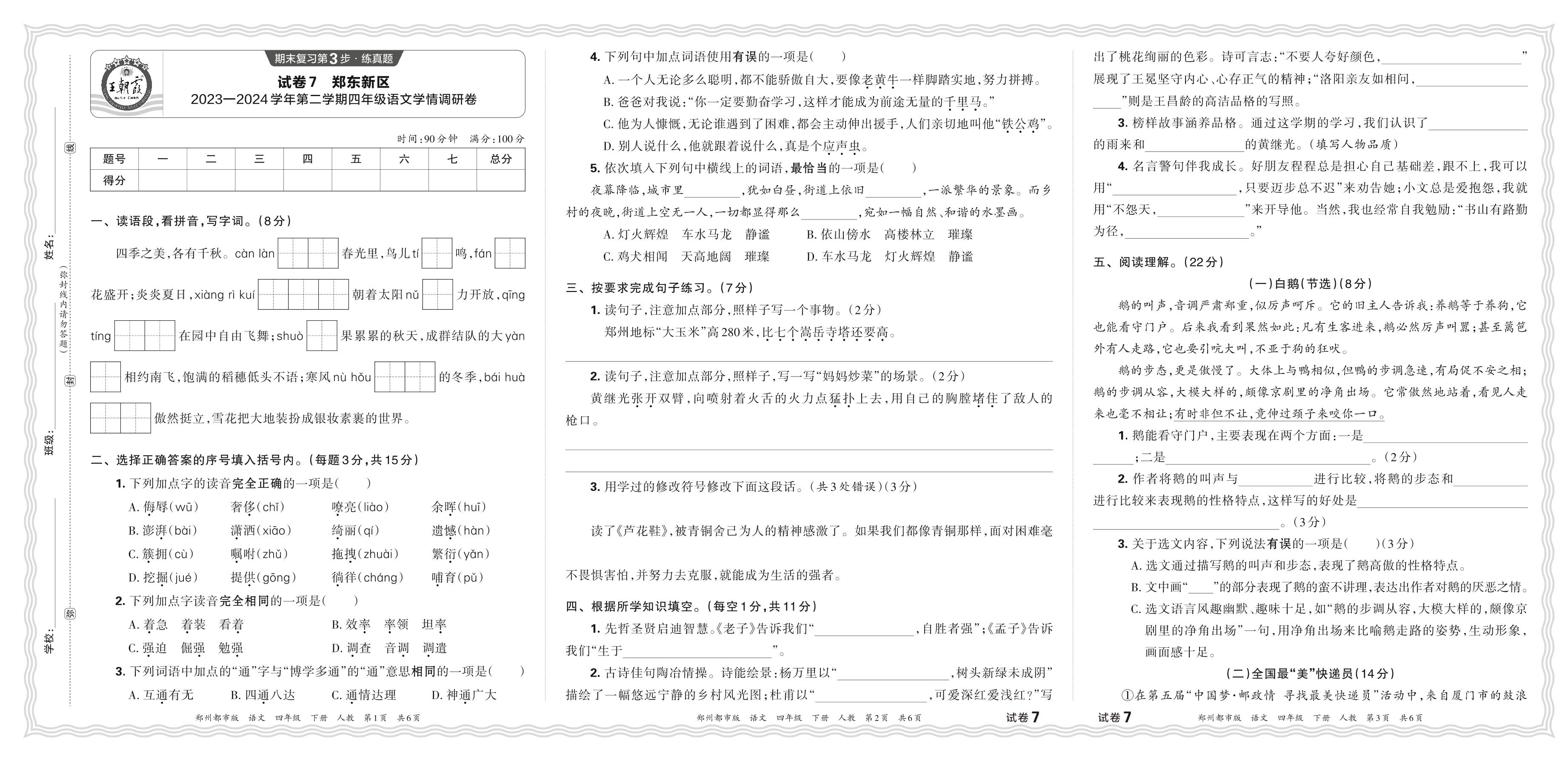 河南省郑州市郑东新区2023—2024学年第二学期四年级语文期末学情调研卷(人教版)【7】