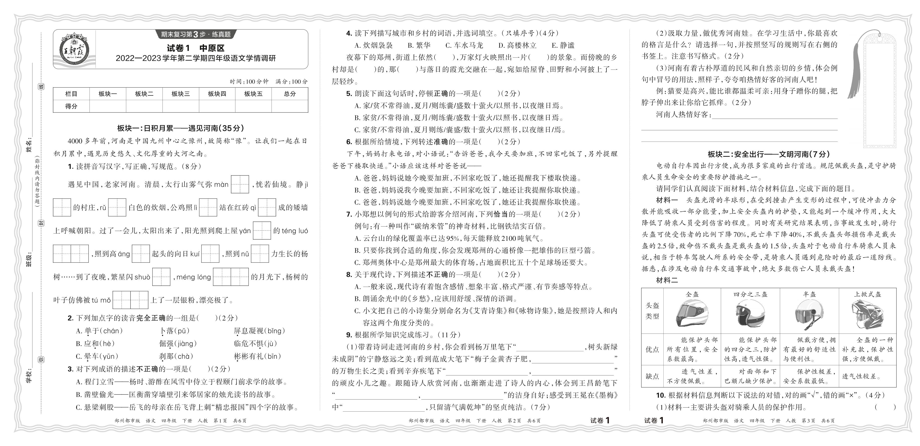 河南省郑州市中原区2022—2023学年第二学期四年级语文期末学情调研(人教版)【1】