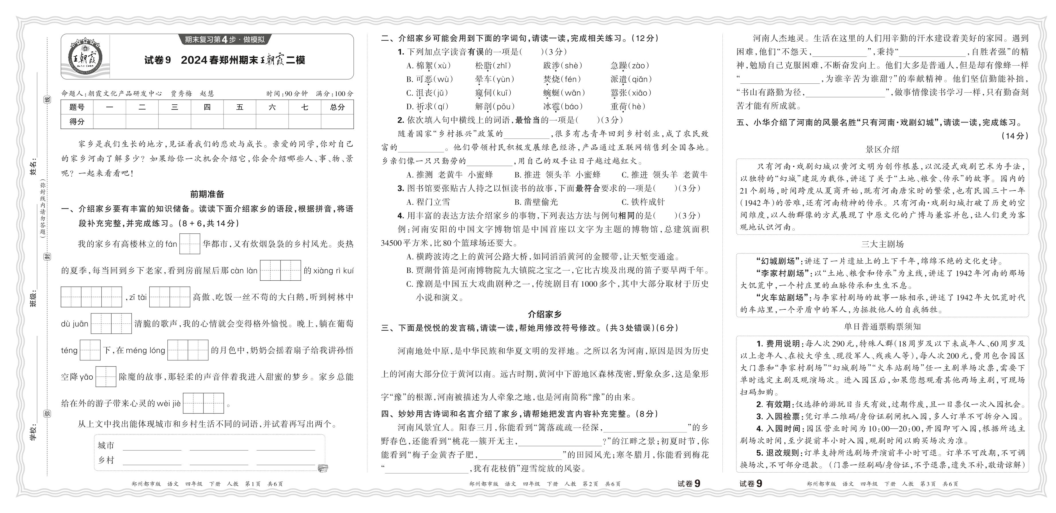 2024春下册四年级语文人教版 河南郑州期末王朝霞二模